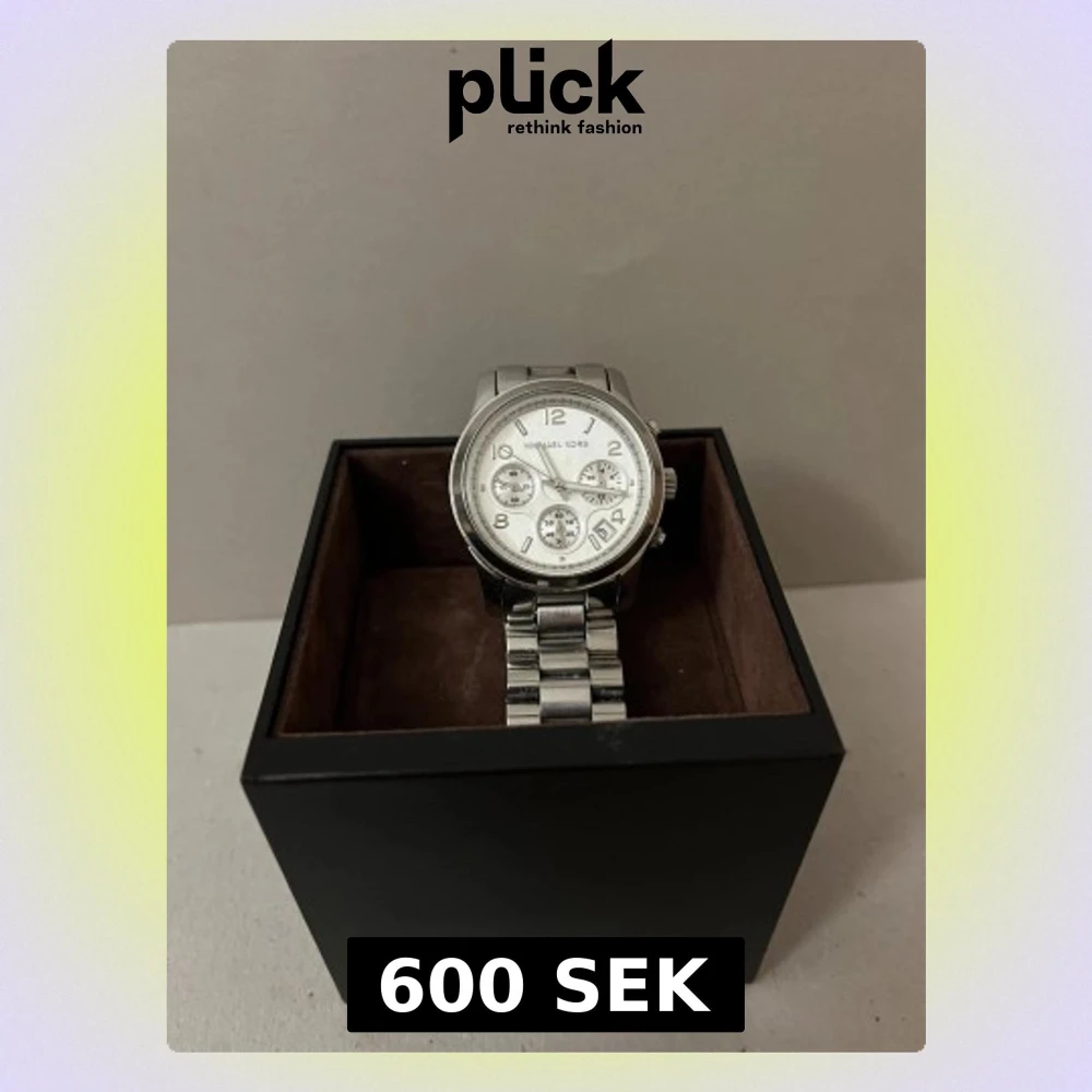 Bilderna visar en silver/vit klocka från Michael Kors med länkarmband och extra länkar. Orginalförpackning med brun mocha för att minska skrapor på klockan. Använd men i bra skick. Batteriet byttes senast för 1 år sedan. Om du har frågor är det bara att höra av dig.