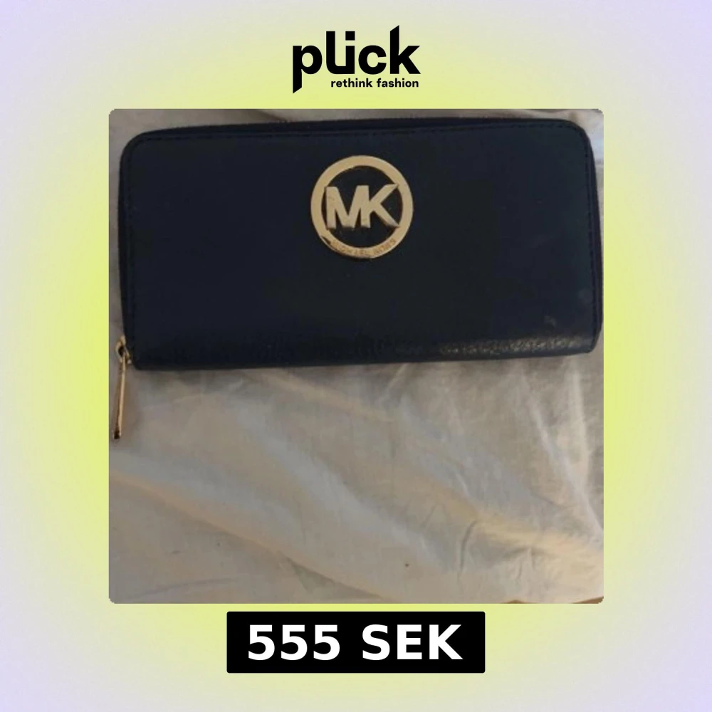 Snygg marinblå plånbok från Michael Kors med ett stilrent guldemblem på framsidan. Plånboken har en praktisk dragkedja som håller dina saker säkra. Perfekt för att hålla ordning på kort och kontanter.