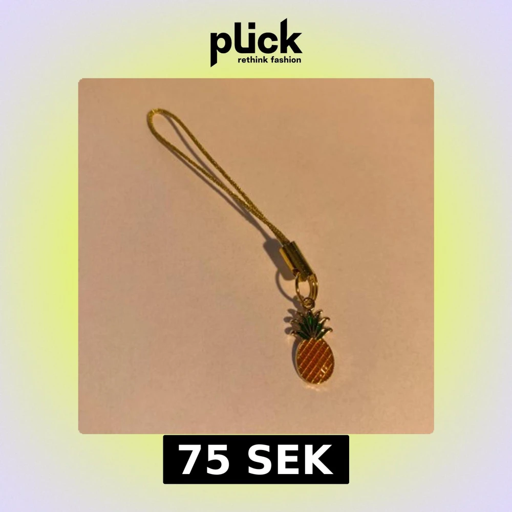 Söt accessoar i form av en ananas med guldfärgad metall och gröna detaljer upptill. Hängsmycket har ett tunt, gult snöre som gör det enkelt att fästa på mobil, väska eller nyckelknippa. Perfekt sommar touch!