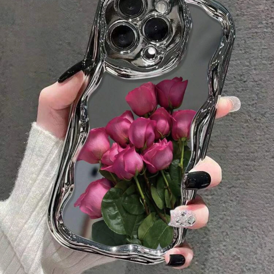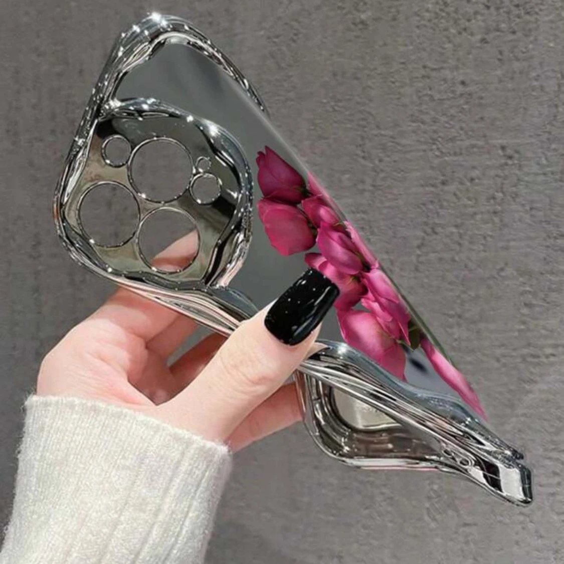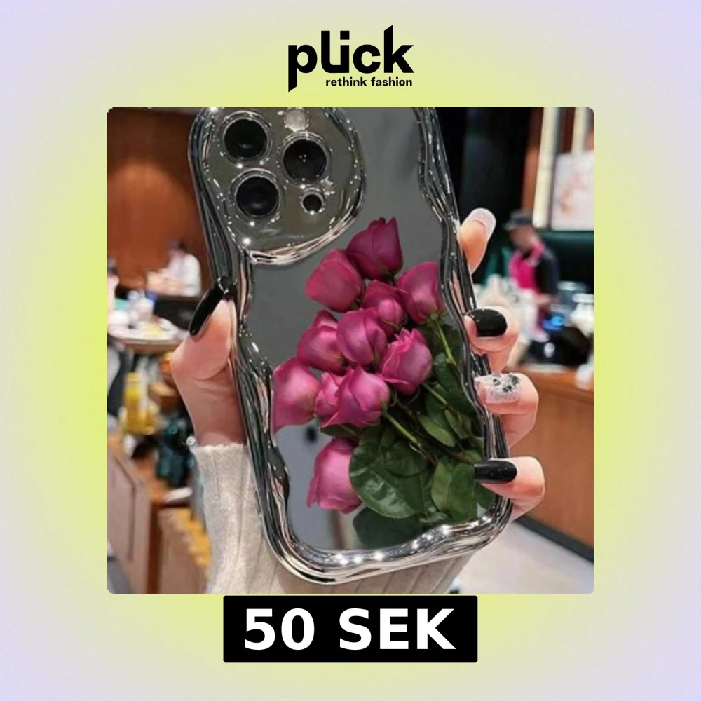 Snygg silvermobil med blommönster. Perfekt för att ha en telefon med ett unikt och slående utseende.