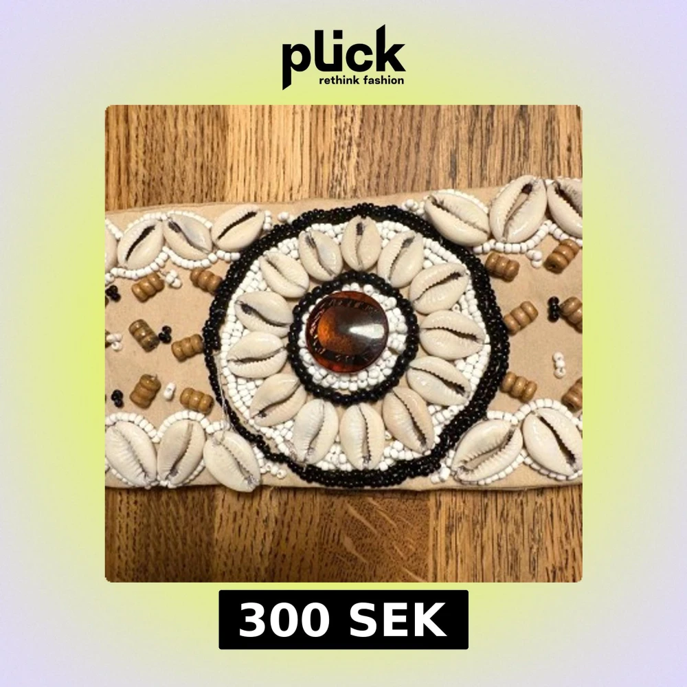 Unikt beige bälte dekorerat med vita snäckor, bruna och svarta samt vita småpärlor. Bältet har ett stort runt mönster i mitten med en brun glansig sten och knyts med en flätad snodd med tofsar. Perfekt för att ge din outfit en boho-vibe.