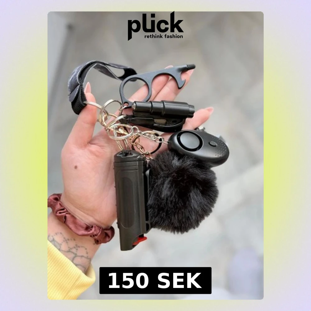 Säljer en svart marbel knippa med svart pompom, bältskärare och fönsterkross, lamp med lampa och dörröppnare med pektouch för smartphone och kapsylöppnare och försvarsspray.