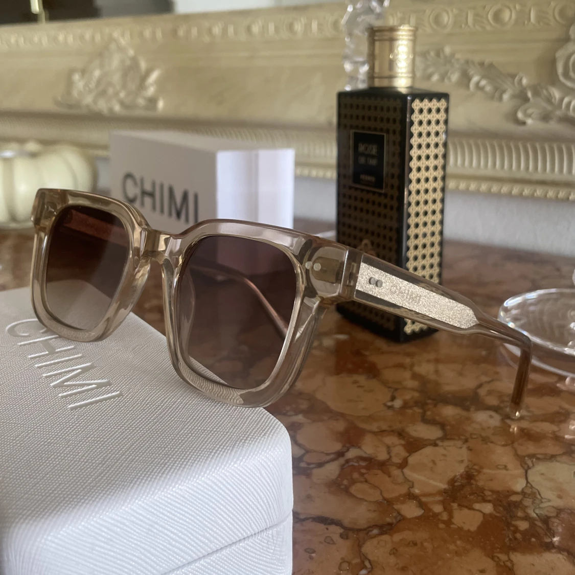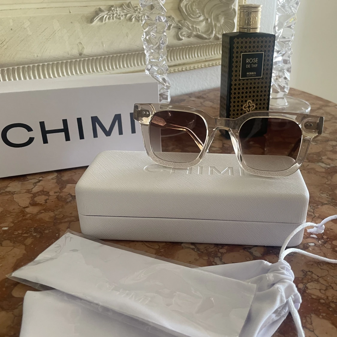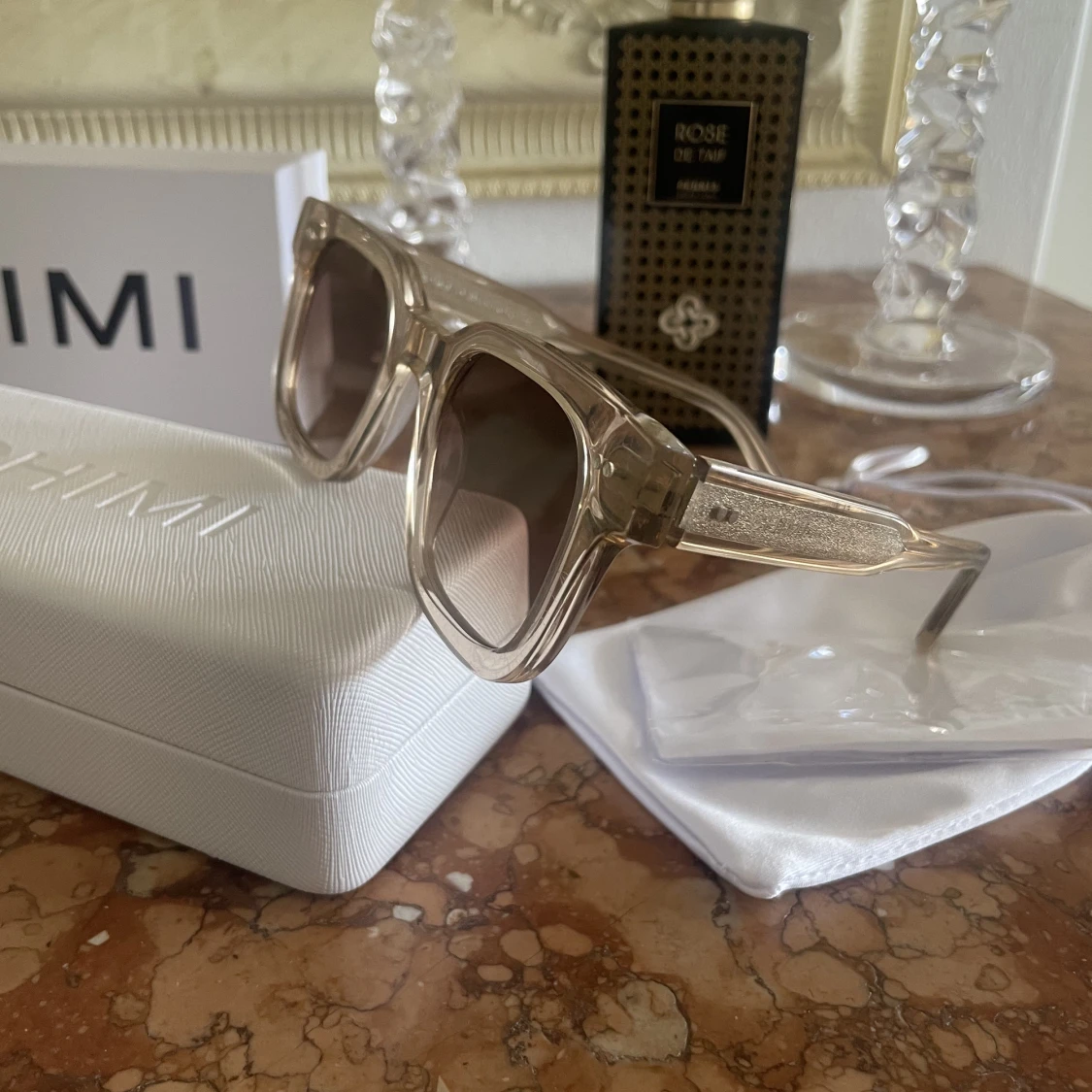 Ett par sjukt snygga chimis i modell 04 Ecru. Du får även med fodrallpåsen, boxen, det hårda fodralet och en oöppnad och orörd duk för att torka chimisen.Är i bra skick men har vissa små repor men det är som sagt väldigt små så det syns inte på bilden❤️❤️