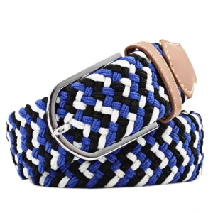 flätat bälte i modellen "Black & White & Blue" Bältet är 105cm långt men går att justera hela vägen ner till 50cm.