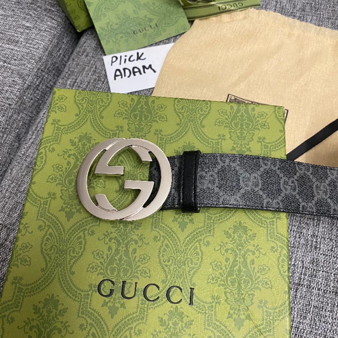 Mycket fint och stilrent Gucci bälte grå med kartong och box, passar perfekt som en fin julklapp eller present