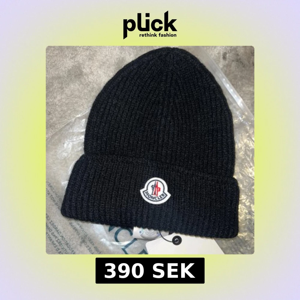 Snygg svart ribbad mössa från Moncler med broderad logotyp framtill. Perfekt för kyliga dagar och ger en stilren look.