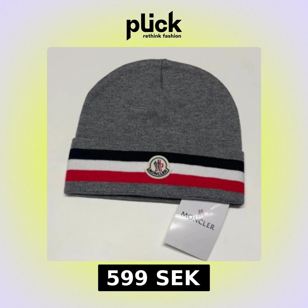 Snygg grå mössa från Moncler med breda ränder i svart, vitt och rött runt kanten. Framtill sitter Monclers klassiska logotyp. Mössan är ribbstickad och har en clean, sportig look som passar perfekt till streetwear. Materialet är mjuk bomull.