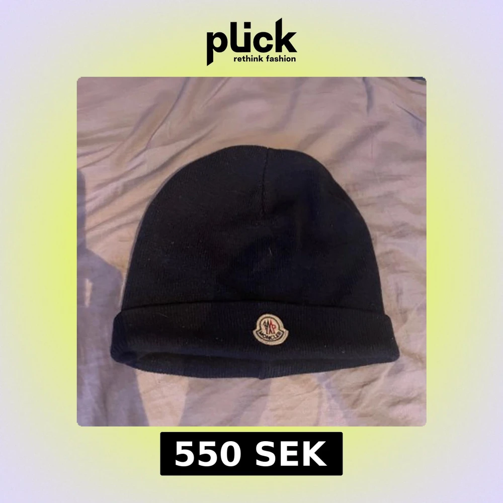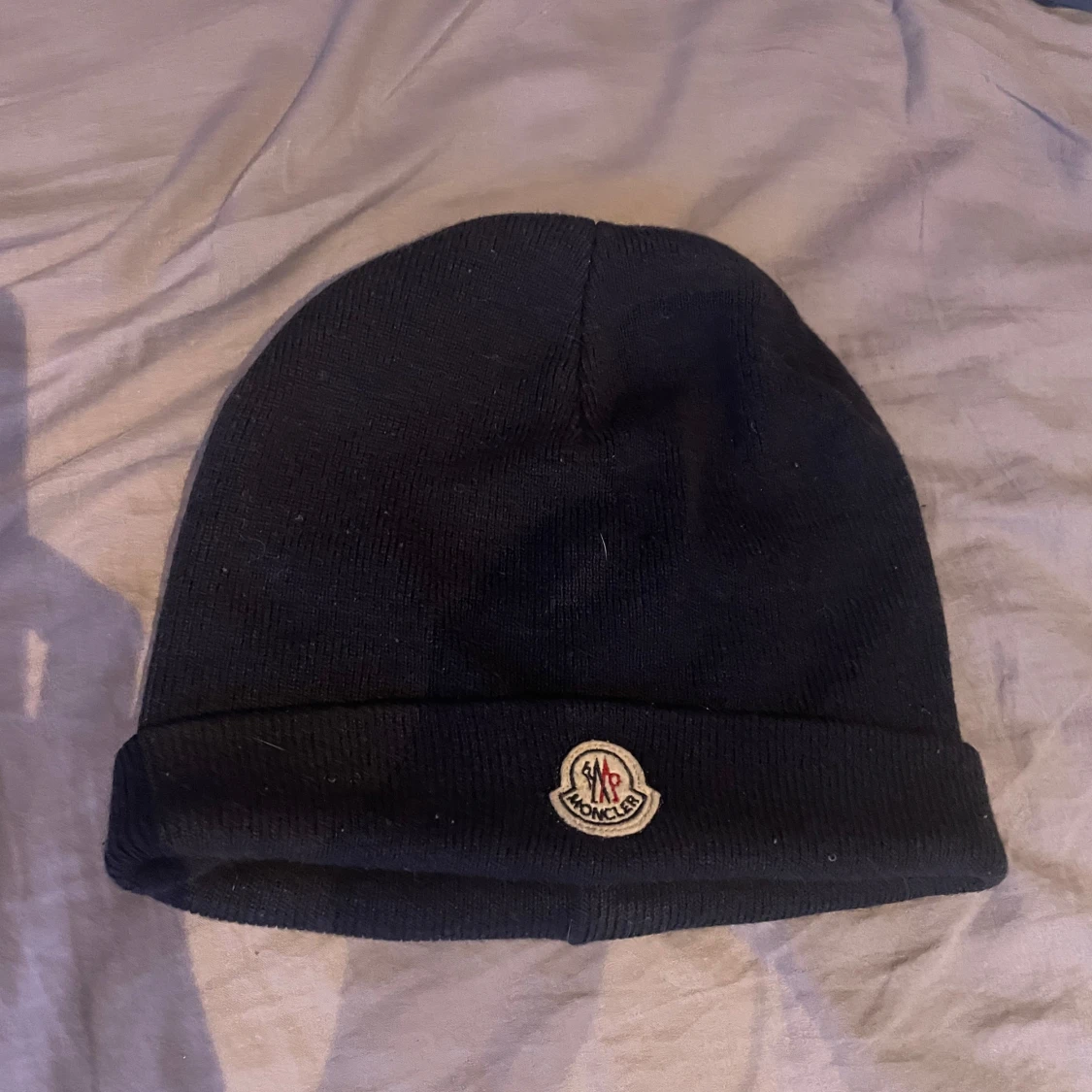 Snygg svart/mörkblå mössa från Moncler med uppvikt kant och broderad logga framtill. Perfekt för kyliga dagar då man fryser om öronen.