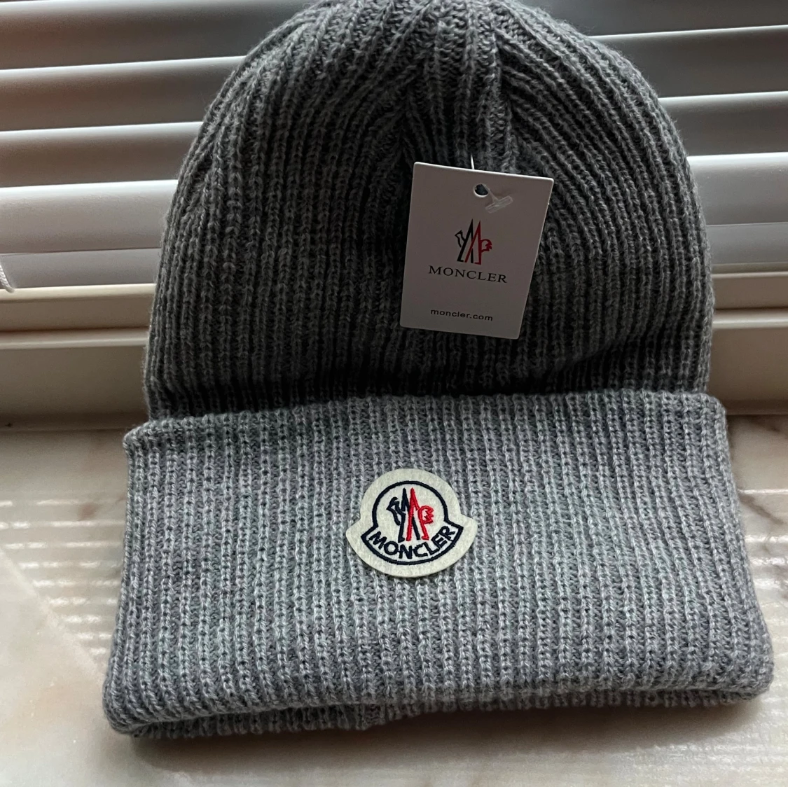 Snygg grå ribbstickad mössa från Moncler med klassisk uppvikt kant och broderad logotyp framtill. Perfekt för att hålla värmen och ge en clean look. Mössan har en neutral grå färg som passar till allt och är tillverkad i mjukt material.