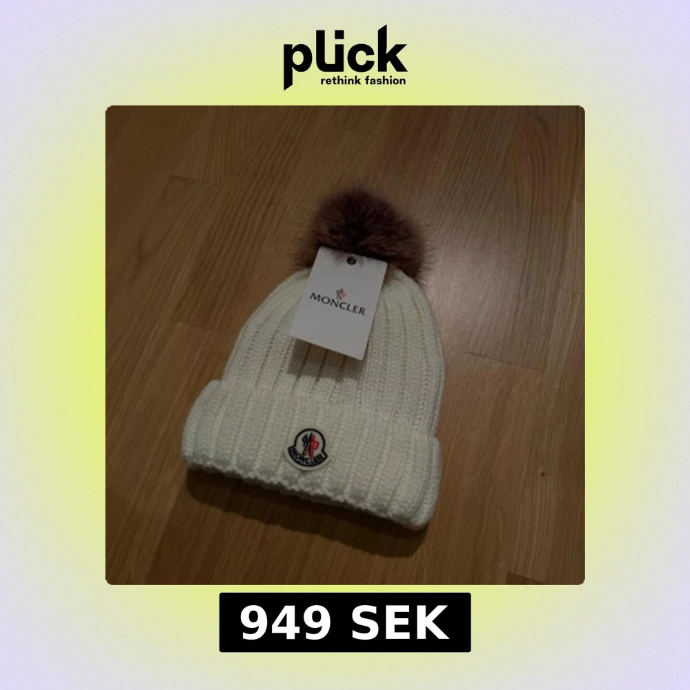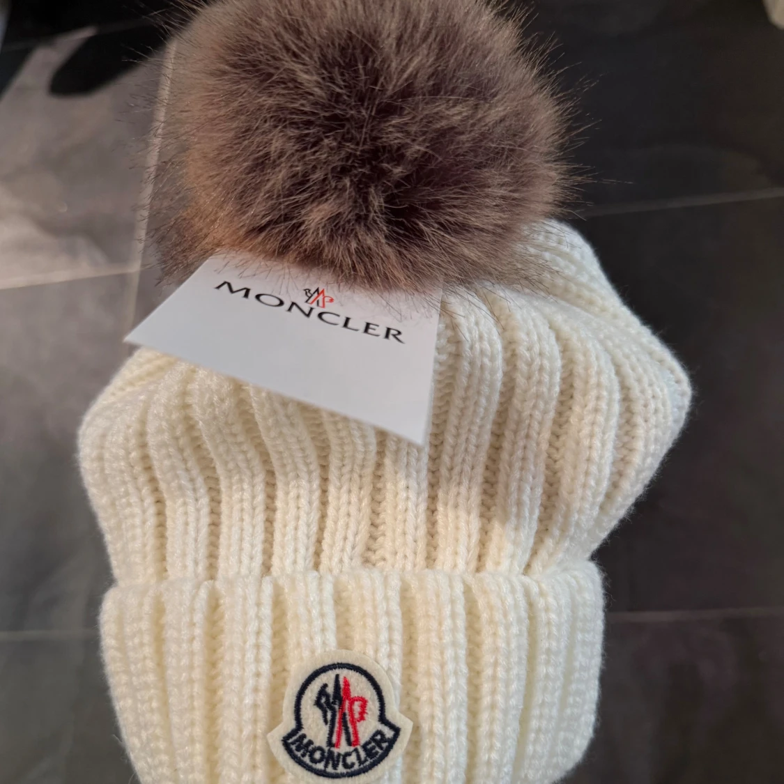 Säljer nu min tjejs helt nya ribbstickad vita mössa från Moncler med stor brun pälsboll på toppen och klassisk Moncler-logga framtill. Mössan har bred uppvikt kant och är tillverkad i mjukt stickat material som håller dig varm och snygg under kalla vinter dagar! Perfekt nu inför julen🎄⛄️❄️