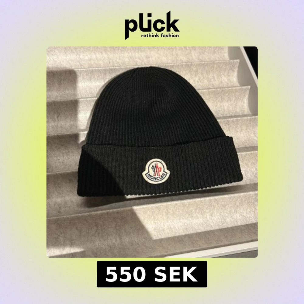 Mörkblå ribbstickad mössa från Moncler med uppvikt kant och klassisk Moncler-logga framtill. Perfekt för kyliga dagar och enkel att matcha med olika outfits. Använd 1 gång.
