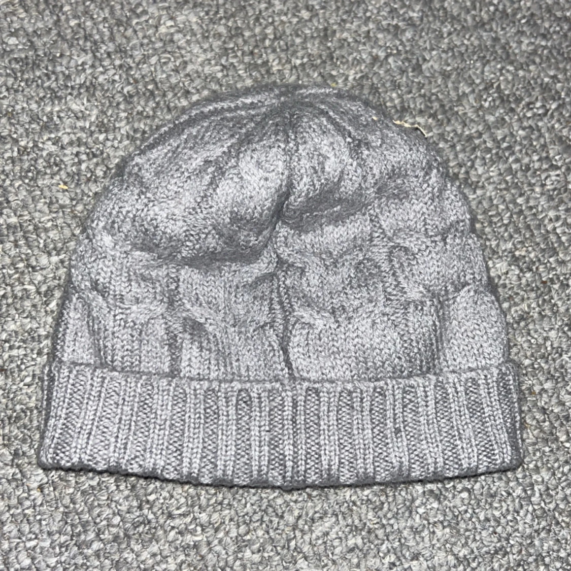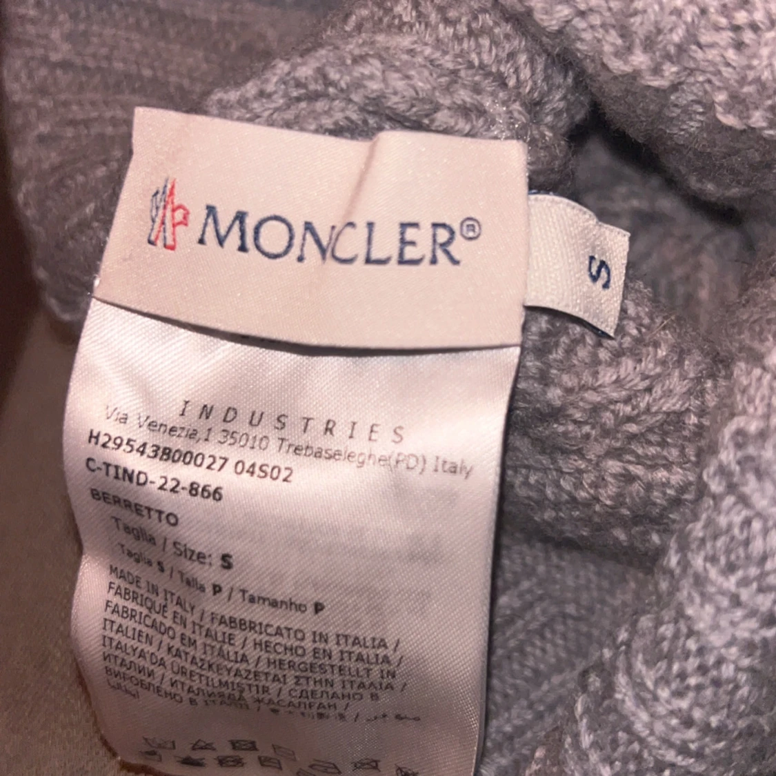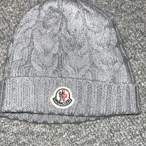 Snygg grå stickad mössa från Moncler med flätmönster och ribbad kant. Perfekt för kyliga dagar. Märkeslogga framtill ger en exklusiv touch.