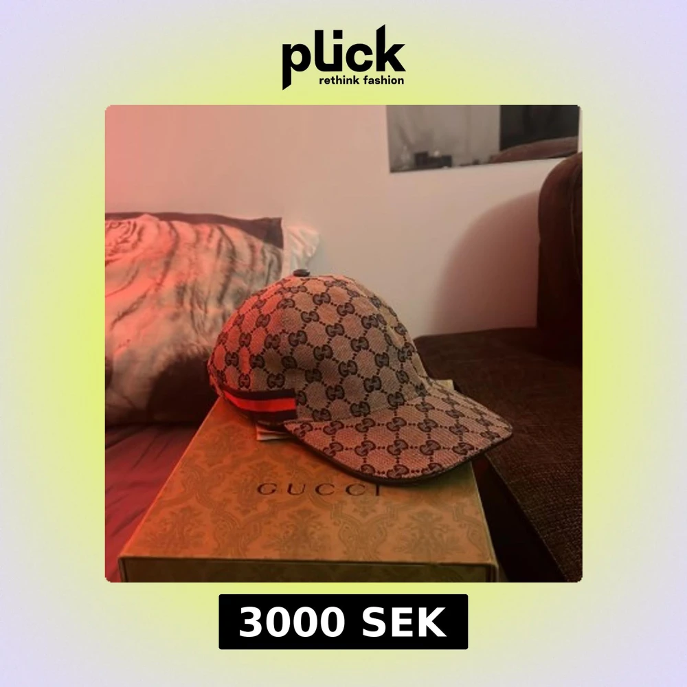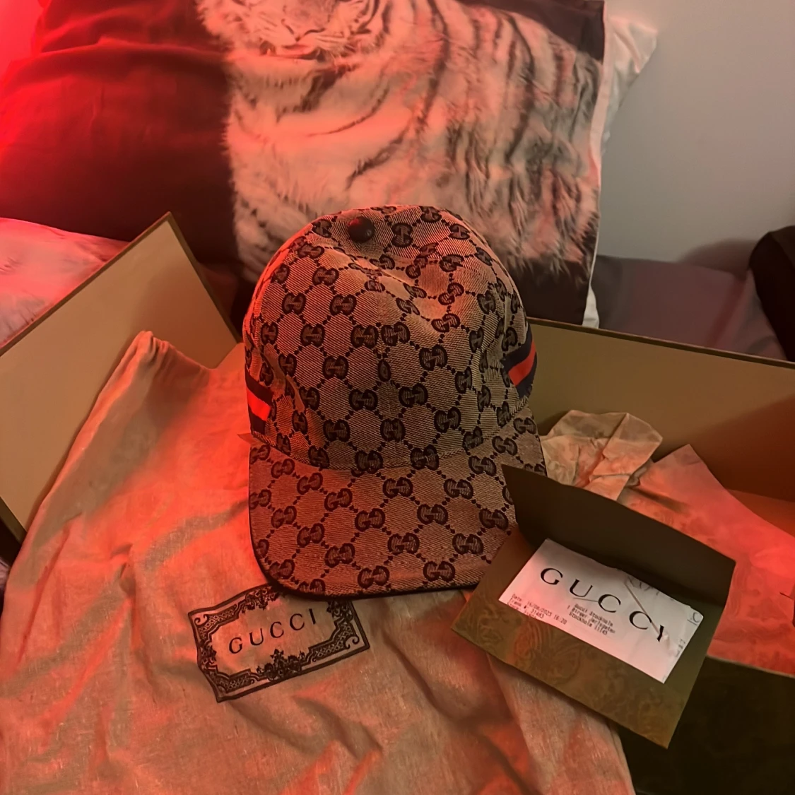 Snygg keps från Gucci med det klassiska GG-mönstret i beige och brunt. Kepsen har en justerbar rem baktill och detaljer i rött och grönt på sidan. Perfekt för att ge din outfit en lyxig touch.