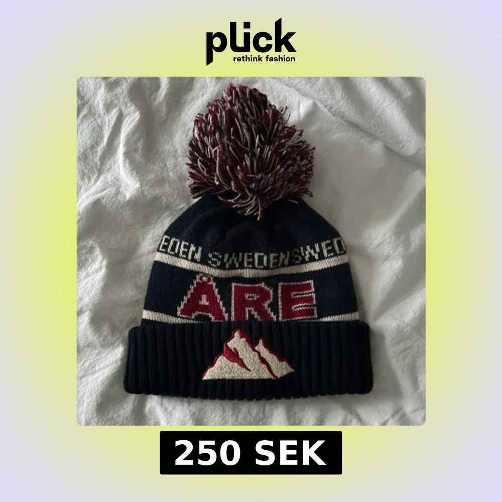 Trendig mörkblå stickad mössa med broderad Åre-text framtill. Perfekt för kalla dagar.