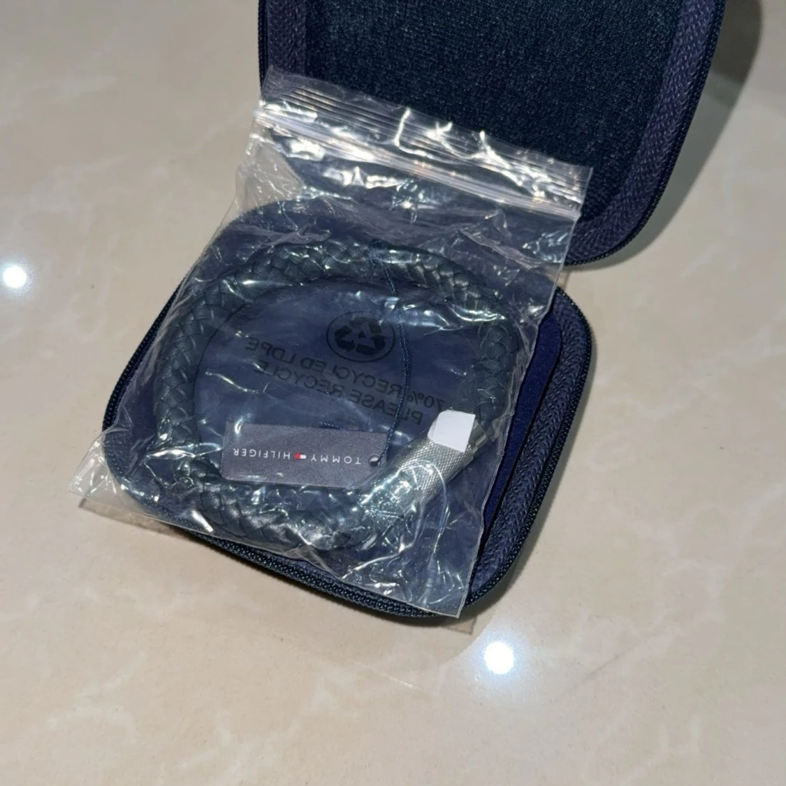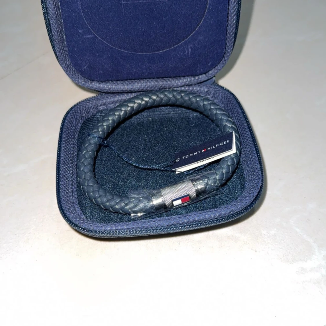 Snyggt mörkblå flätat armband från Tommy Hilfiger i en praktisk förvaringsväska. Armbandet har en stilren design med en metallisk låsdetalj som pryds av varumärkets logotyp.