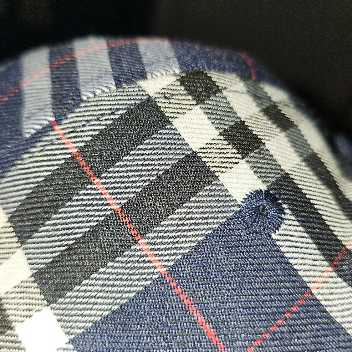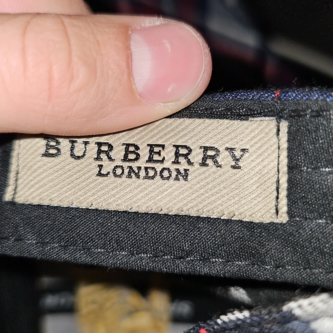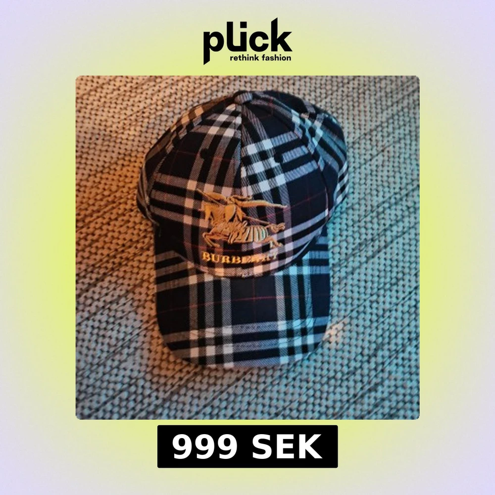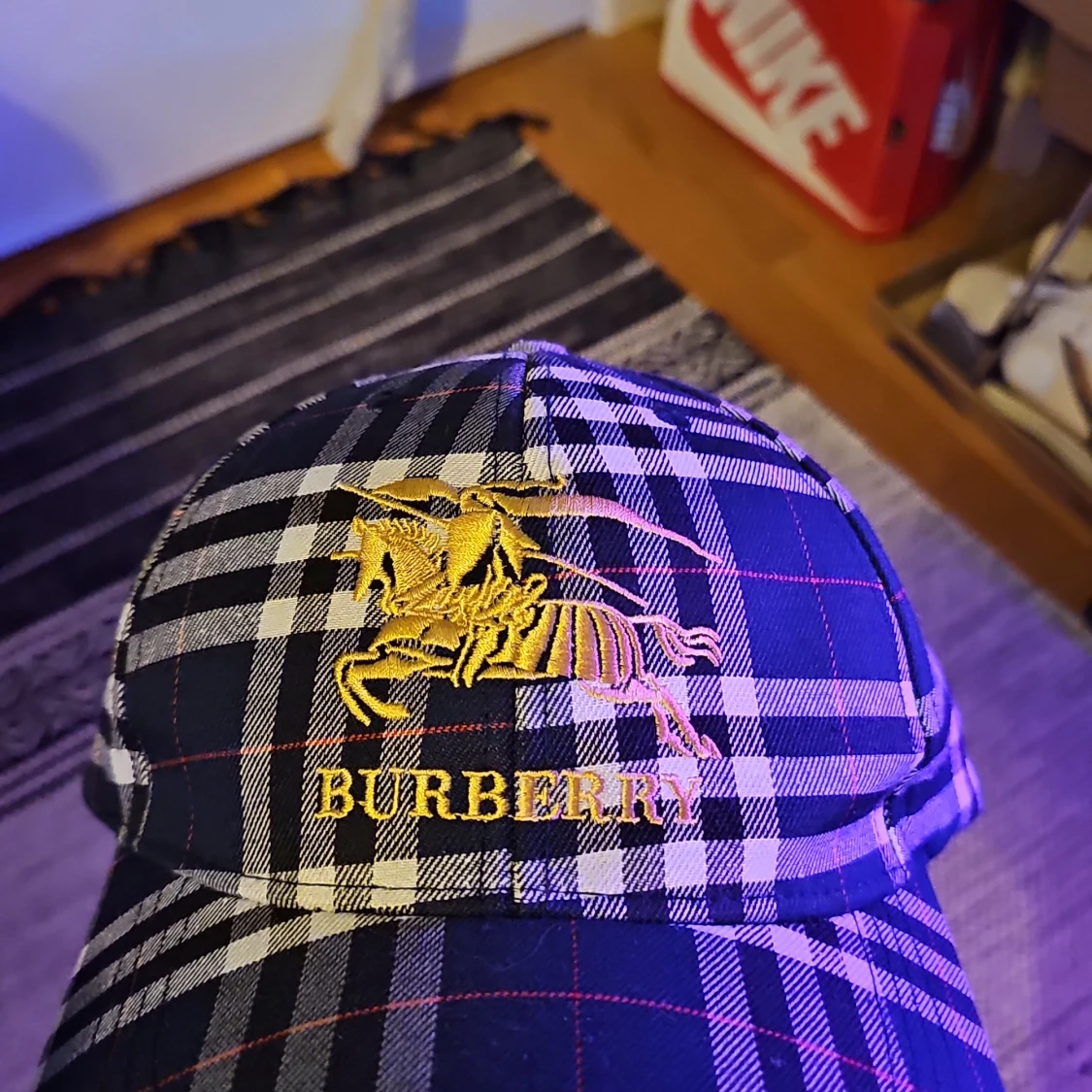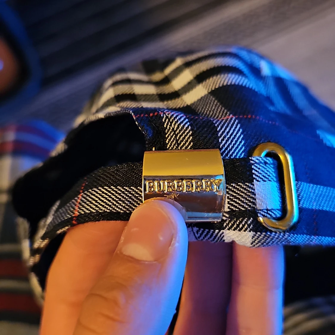 Snygg keps från Burberry i klassiskt rutigt mönster i svart, vitt och blått med röda detaljer. Framsidan har en guldfärgad brodyr med Burberry-logga och riddare. Justerbart spänne bak i guldmetall med Burberry-gravyr. Perfekt accessoar för en trendig look. Köpt begagnad och säljer pga att jag ogillar färgen.