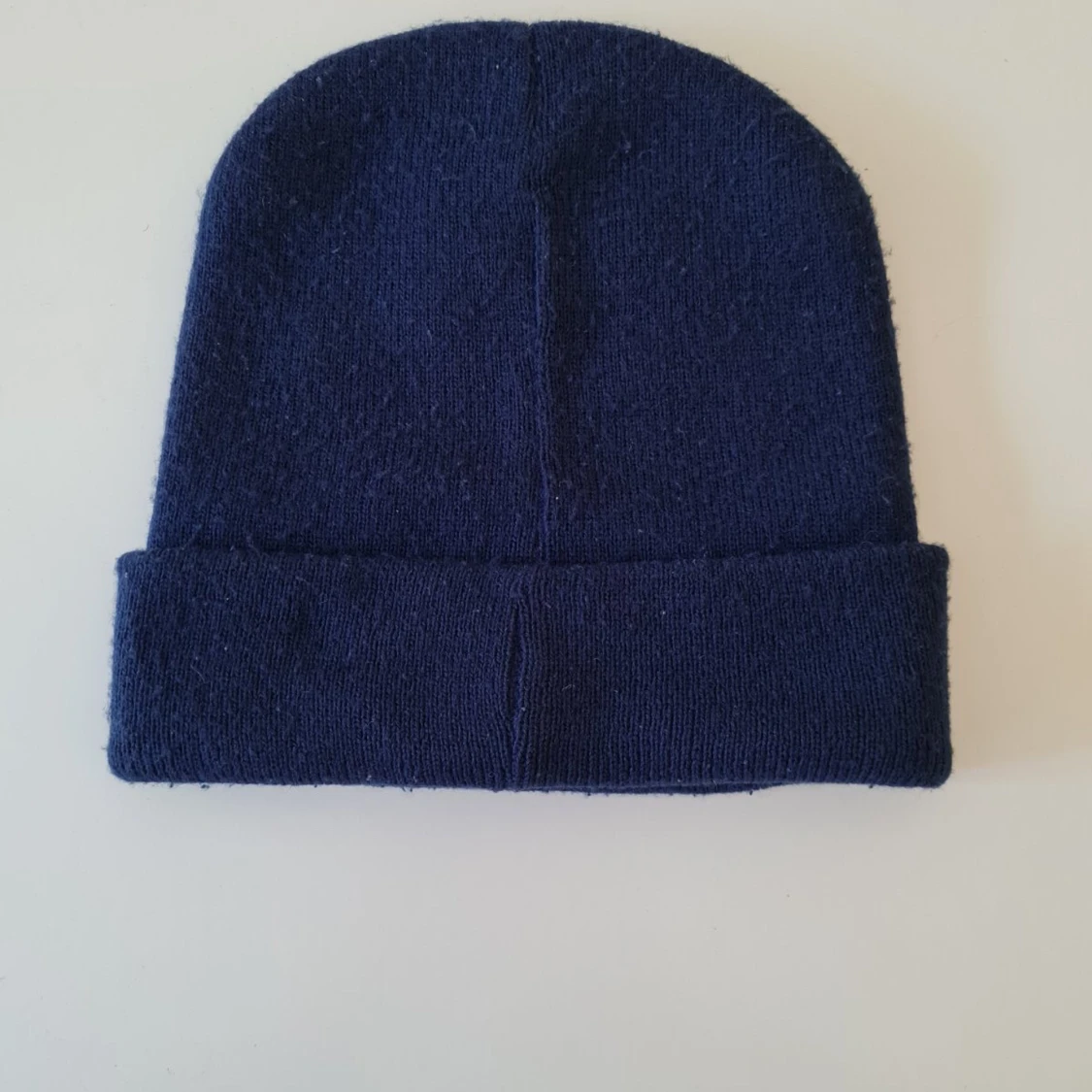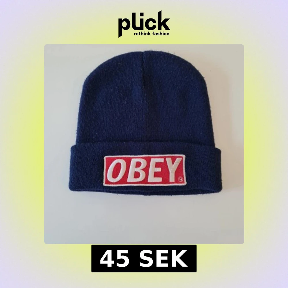 Mörkblå stickad mössa från OBEY med uppvikt kant och stor broderad OBEY-logga i vitt och rött framtill.