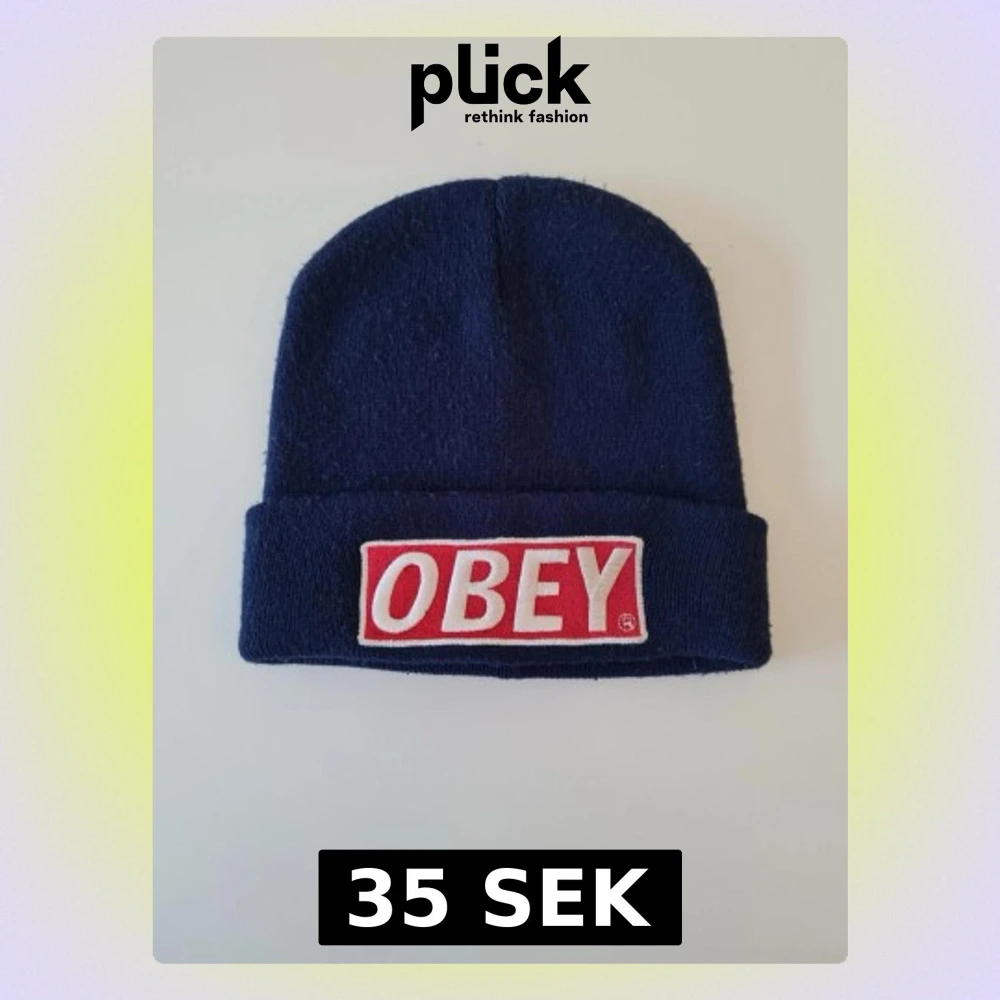 Mörkblå stickad mössa från OBEY med uppvikt kant och stor broderad OBEY-logga i vitt och rött framtill.