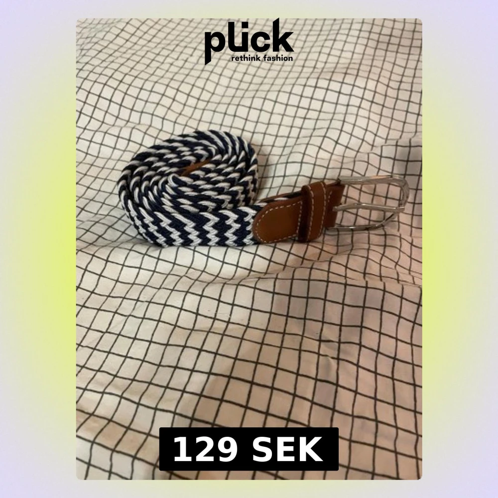 Säljer ett snyggt flätat bälte i mörkblått och vitt med bruna skinn-detaljer och silvrigt spänne. Bältet har ett zigzag-mönster och passar perfekt till jeans eller chinos. Stilren och modern look som lyfter outfiten.