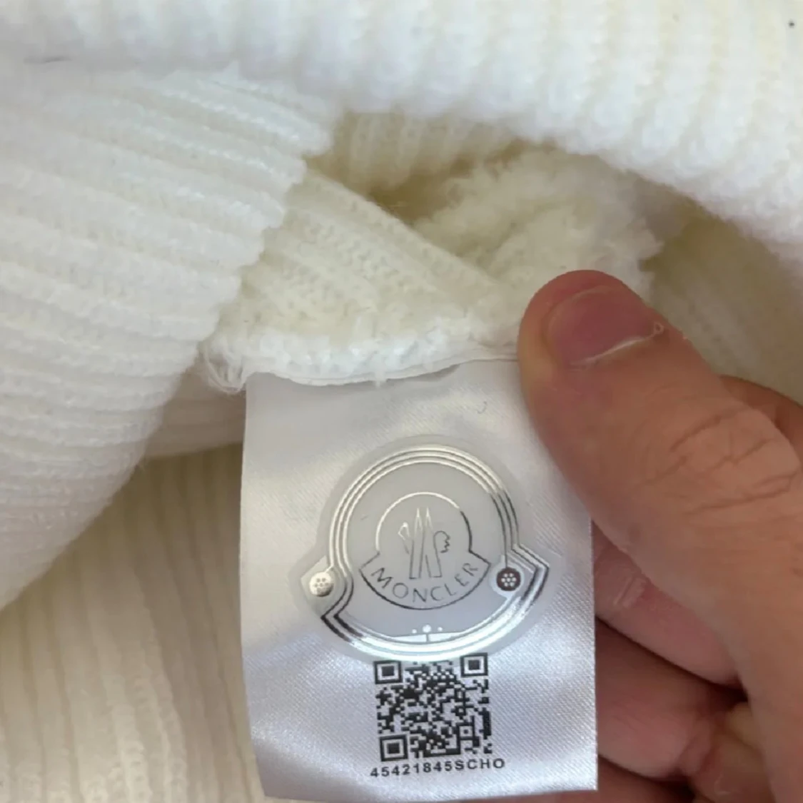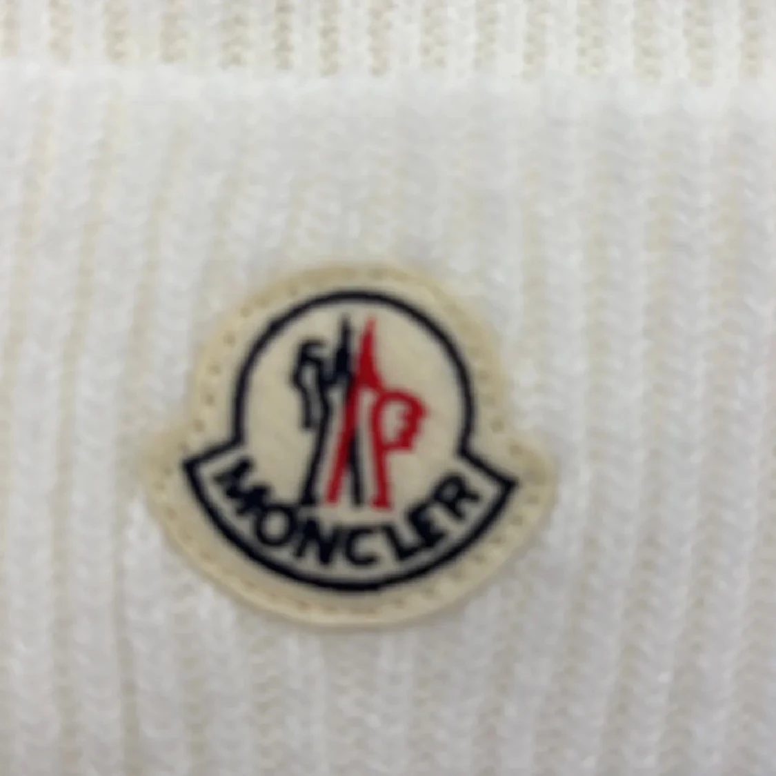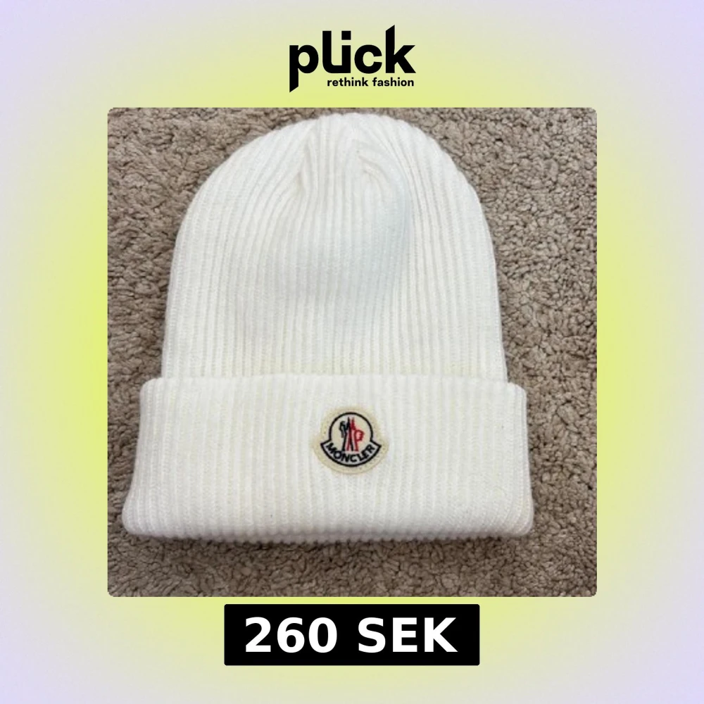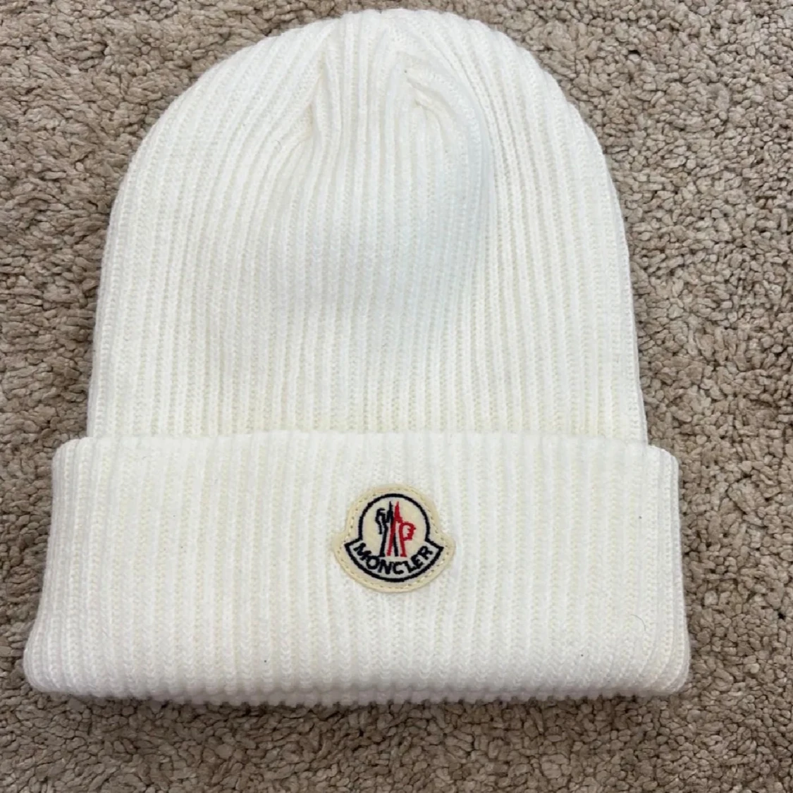 Säljer en stilren vit ribbstickad mössa med klassisk uppvikt kant och broderad logotyp framtill. Mössan är tillverkad i mjukt material som håller dig varm och passar perfekt till kyliga dagar. Enkelt och cleant plagg för dig som gillar exklusiva accessoarer.