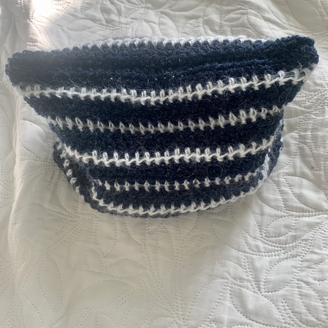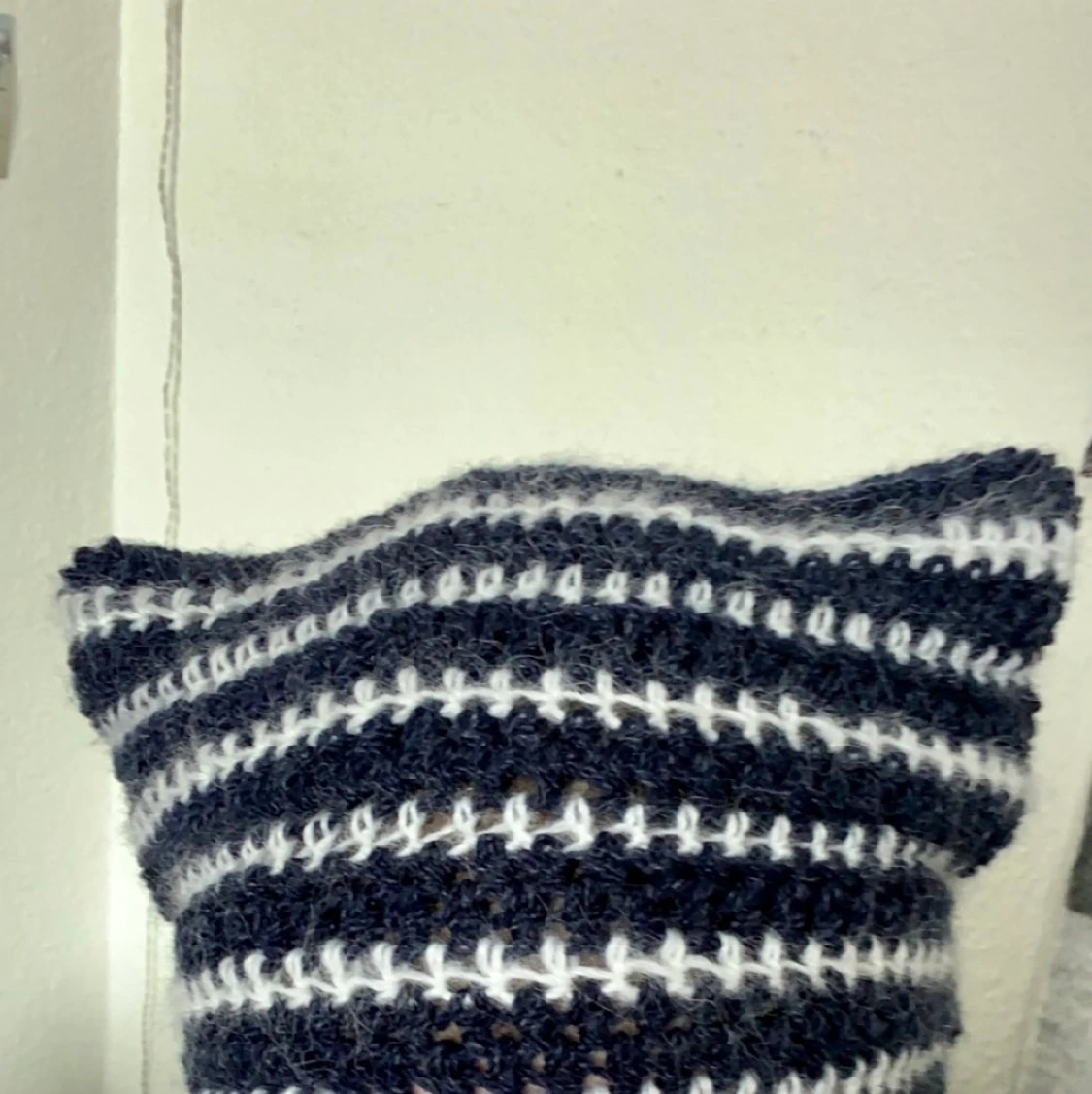 En virkad mössa med fyrkantigform som gör att de ser ut som kattöron nÀr man har pÄ sig