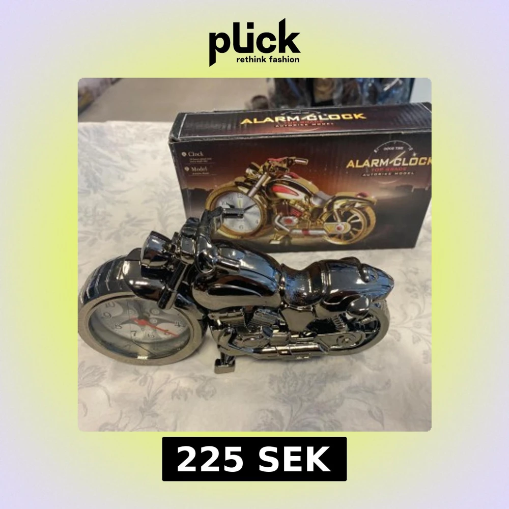 Cool motorcykelväckarklocka i metallisk design. Finns i både silver och guld med detaljer som liknar en riktig motorcykel. Klockan är placerad i framhjulet och har tydliga siffror med en röd sekundvisare. Perfekt för motorcykelentusiaster! 225kr/st