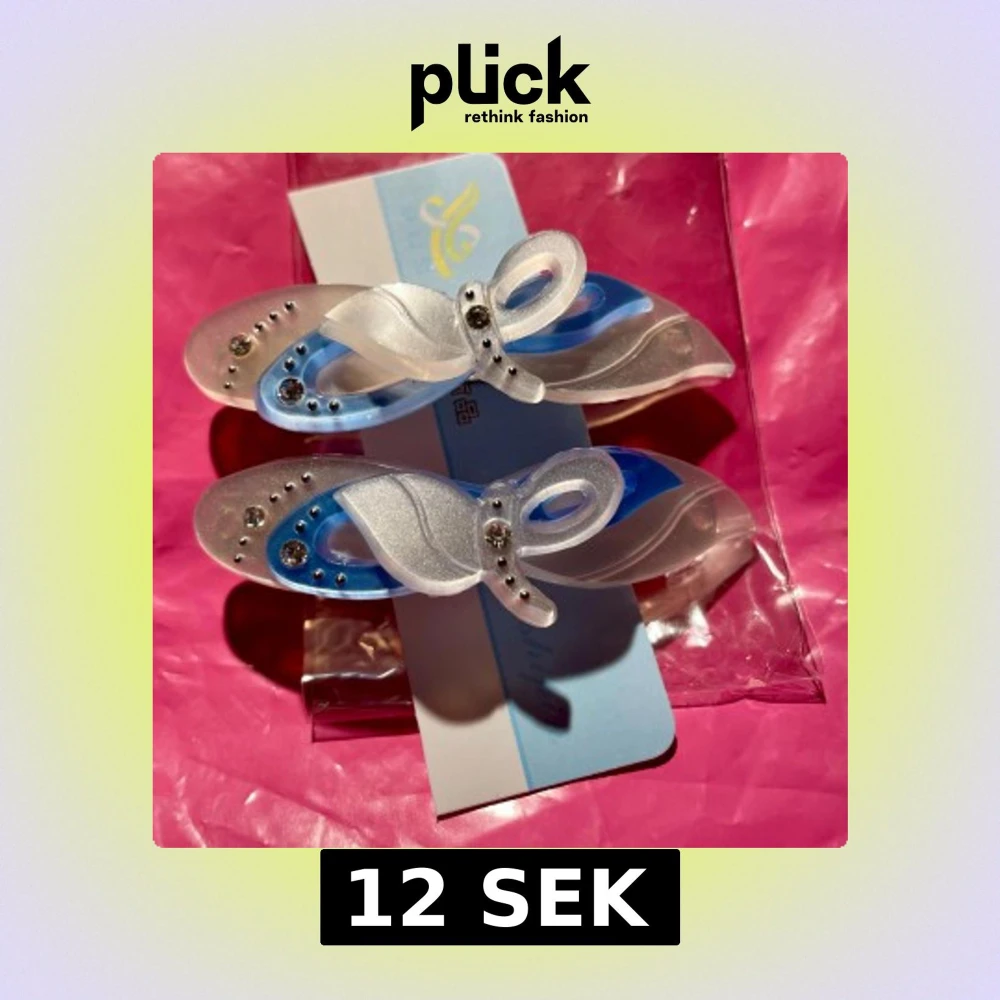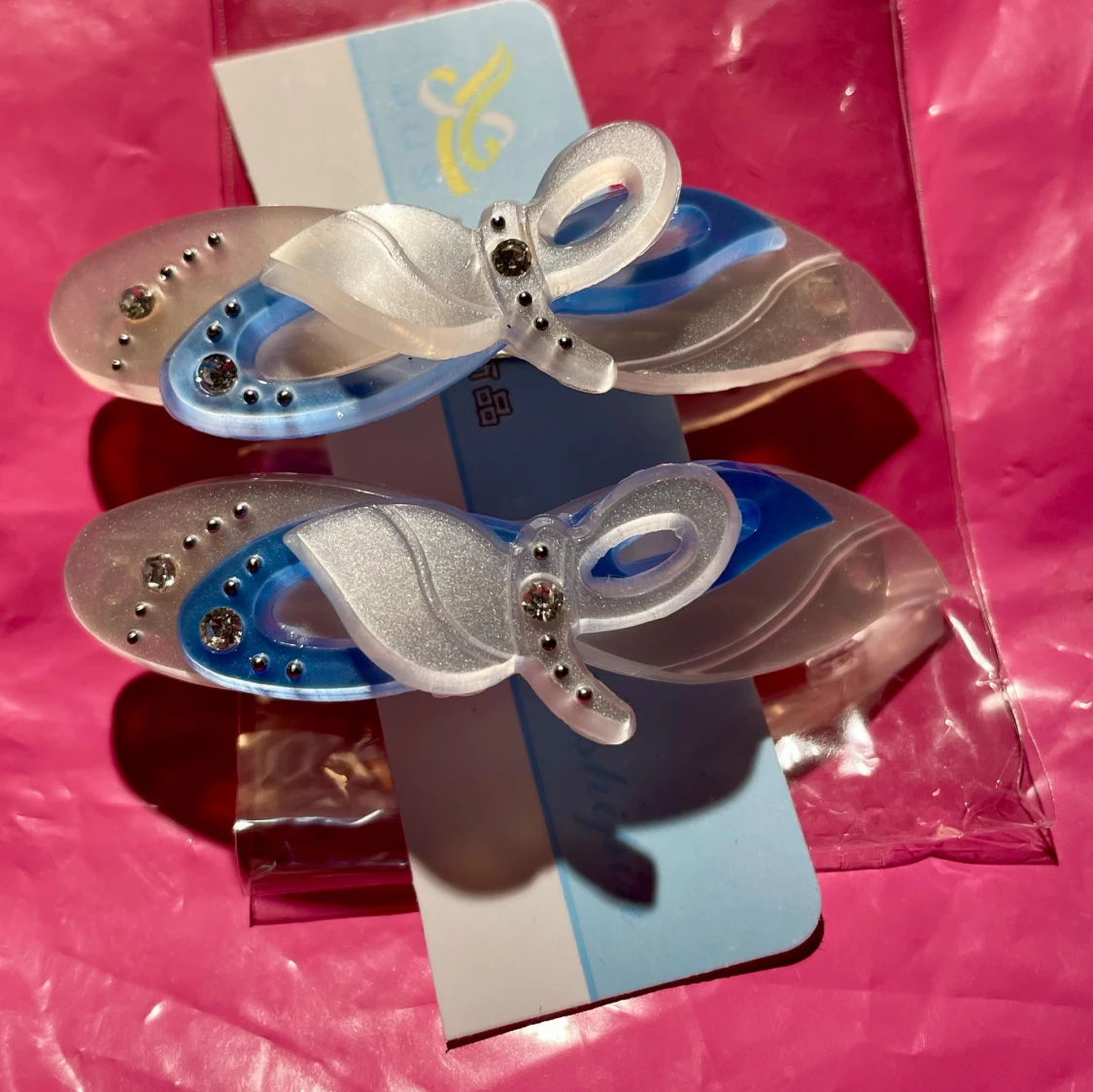 Två snygga hårklämmor i blått och vitt med glittrande strassdetaljer och en trollslända i en cool, böjd form. Spännena har en transparent finish och dekoreras med små silvriga stenar som ger extra bling. Perfekt för att piffa upp frisyren med lite färg och glitter.