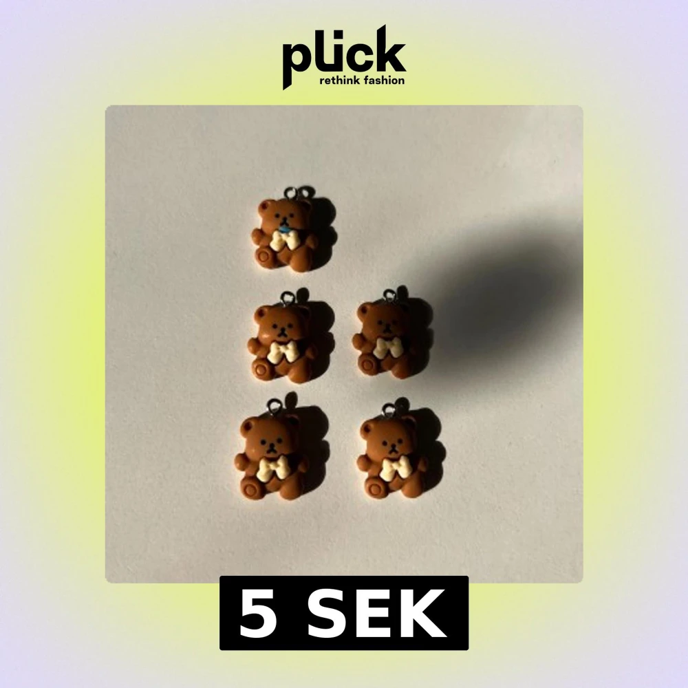 Fem gulliga björnberlocker i brun färg med beige rosett, perfekta att använda som hängsmycke till halsband, armband eller örhängen. De har små öglor upptill för enkel montering. Berlockerna är formade som nallebjörnar och har handmålade detaljer. 5kr styck.