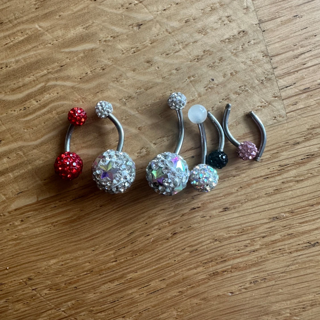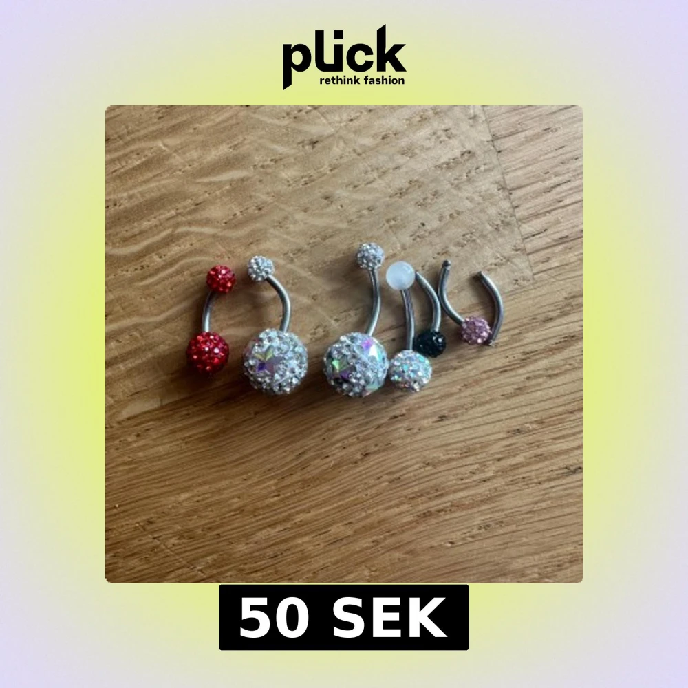 Säljer ett set med navelpiercingar i olika färger. De har glittriga kulor i rött, silver, svart och rosa. Perfekt för att ge lite extra bling till din stil! Även lite extra reservdelar som syns på bilden! Allt för 50kr