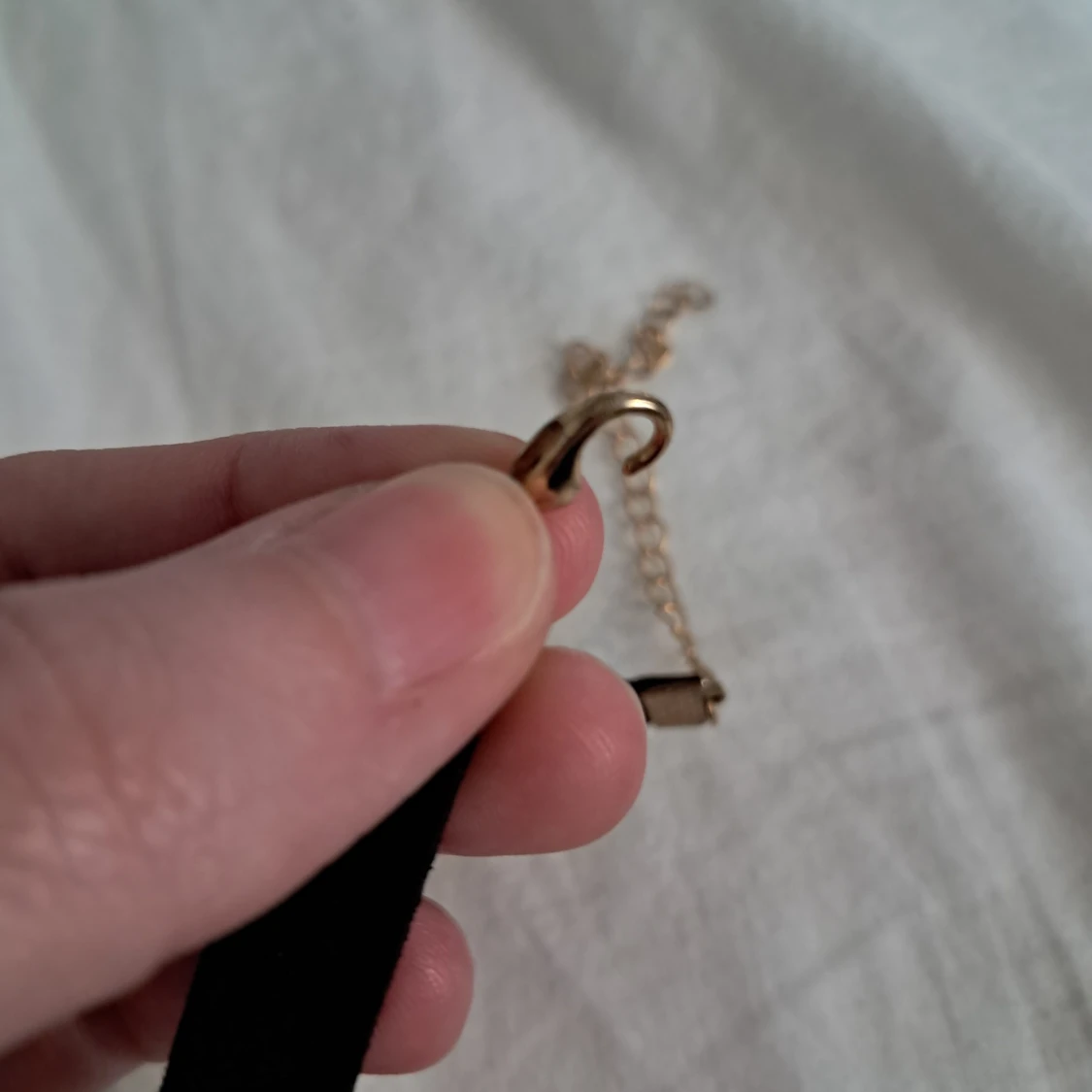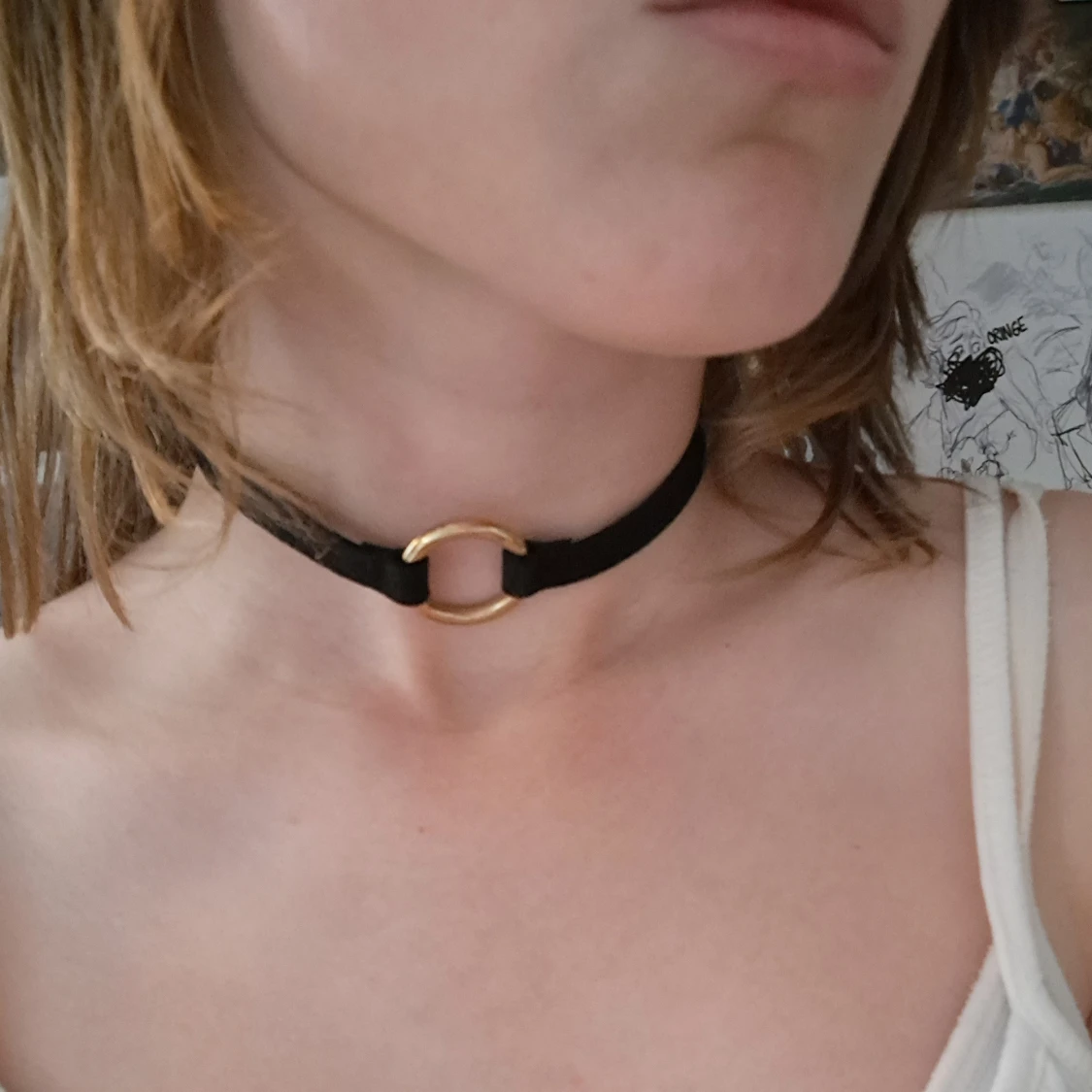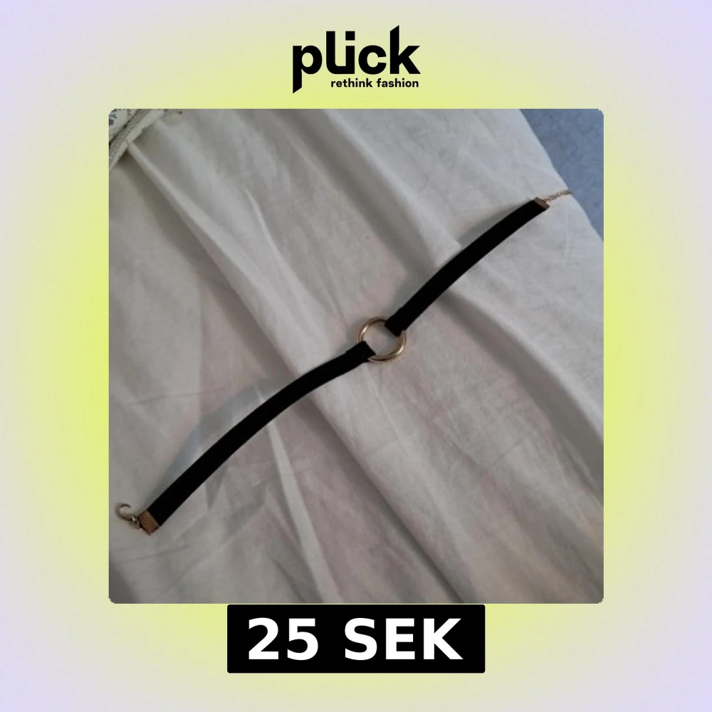 Snygg svart choker med en rund guldfärgad metallring i mitten. Halsbandet har ett brett, sammetsliknande band, typ filttyg, och justerbart spänne i guldfärg. Perfekt accessoar för att ge din outfit en goth vibe. Spännet är lite sönder men funkar ändå. Jag använde det till cosplay.