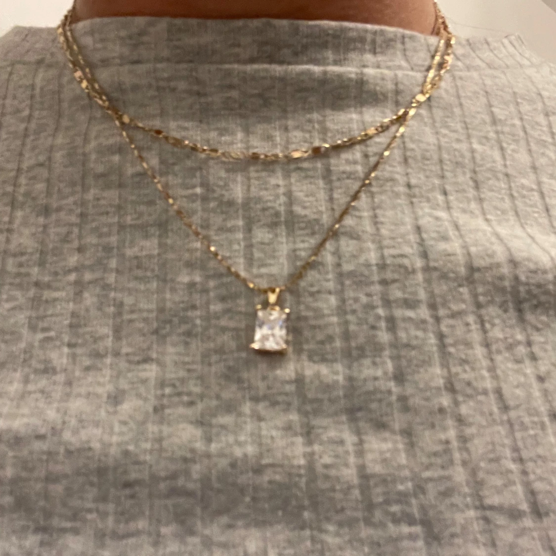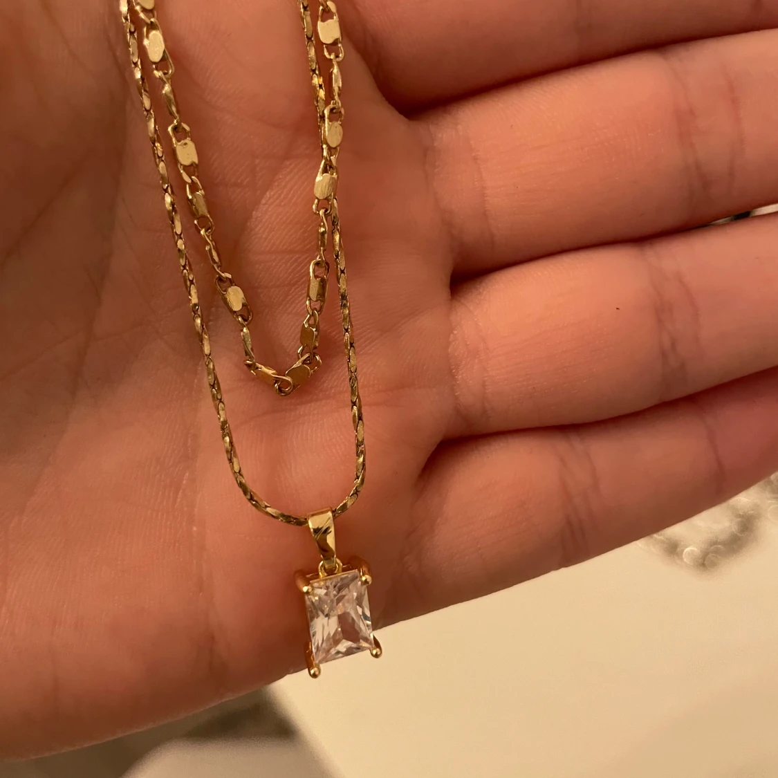Elegant guldhalsband med en fyrkantig, klar kristallhänge. Kedjan har en fin länkdesign som ger en lyxig känsla. Perfekt för att lägga till en touch av glamour till din outfit.