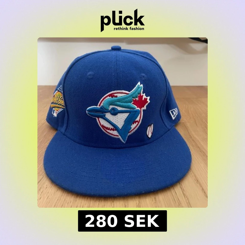 Snygg blå 59FIFTY keps från New Era med Toronto Blue Jays logga framtill, broderad World Series 1992-patch på sidan och coolt broderi med texten 'Love & Hustle = Game' bak. Kepsen är i klassisk basebollstil och har platt skärm. Materialet är polyester.