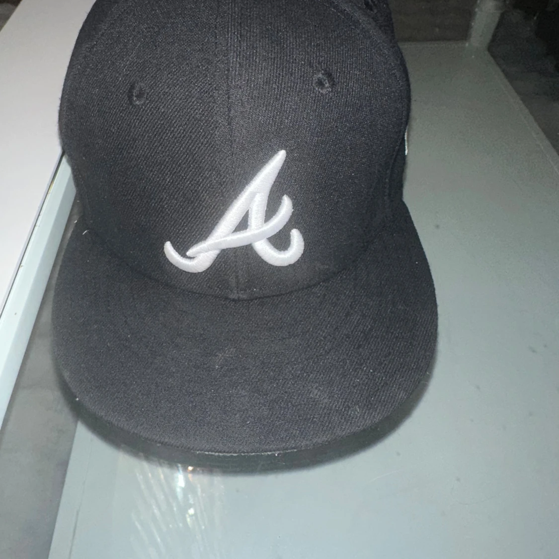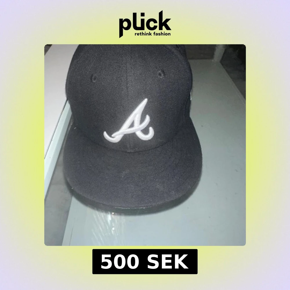 Säljer en svart keps från New Era med Atlanta Braves-logga broderad i vitt framtill. Baksidan har broderad text 'Greetings from Atlanta' och gröna vägskyltar. Klassisk rak skärm och snygg streetstil, perfekt för dig som gillar sport och urban look.