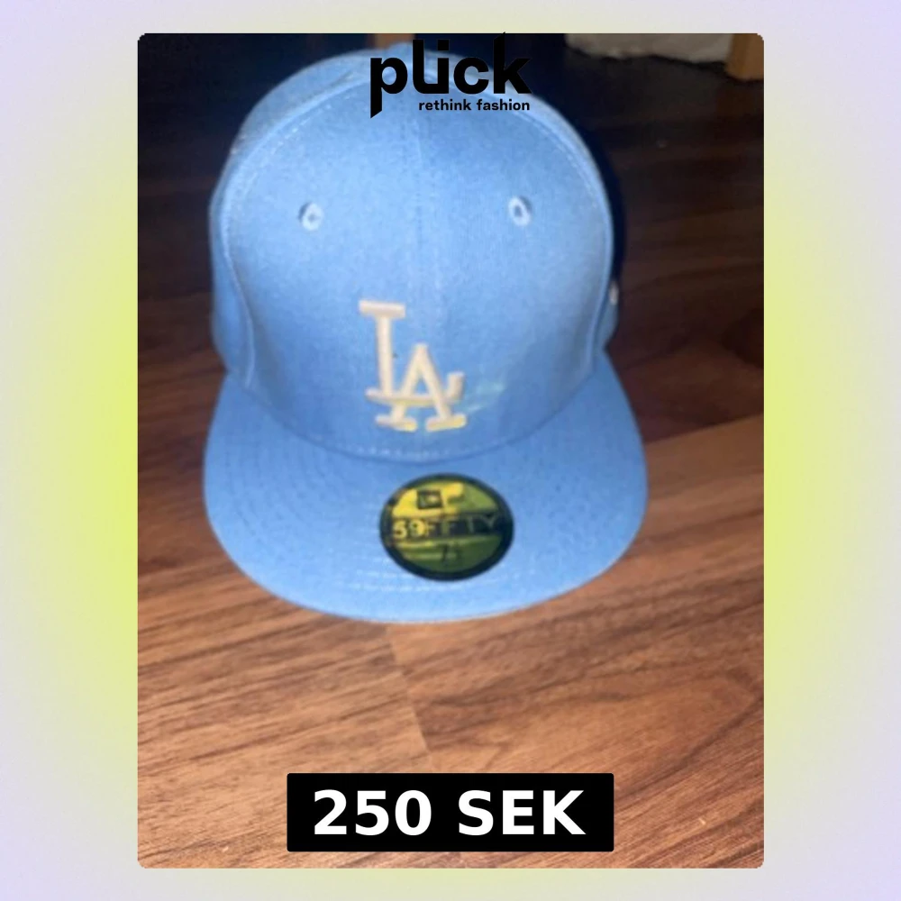 Säljer en ljusblå LA Dodgers keps från NE modell 59FIFTY. Kepsen har broderad LA-logga i vitt framtill och NE-logga på sidan. Skärmen är platt och undersidan är grå. Materialet är bomullstyg och passformen är klassisk fitted.