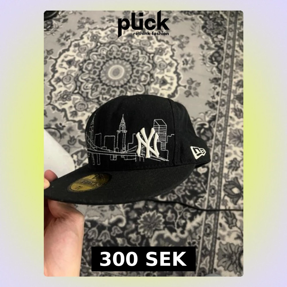Säljer en svart New Era 59FIFTY keps med broderat New York Yankees-logo och vit stadssilhuett runt hela kepsen. Klassisk flat brim och detaljerad brodyr med bro och skyskrapor. Märkt Genuine Merchandise på insidan.