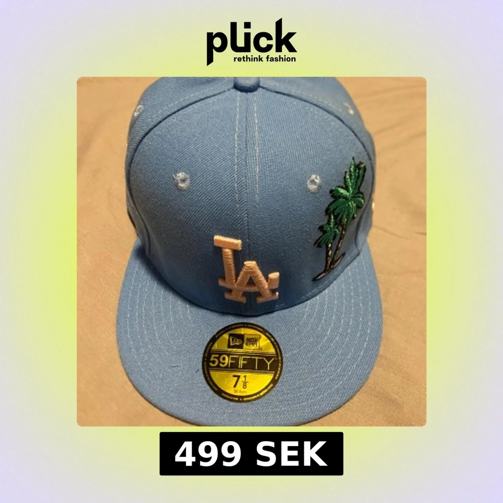 blå keps från New Era med broderad LA-logga och palmer på framsidan. Kepsen har även ett broderat emblem. Den är i storlek 7-1/8 och har en rak skärm. Helt Ny. Pris kan diskuteras. Storleken i cm är 57cm.