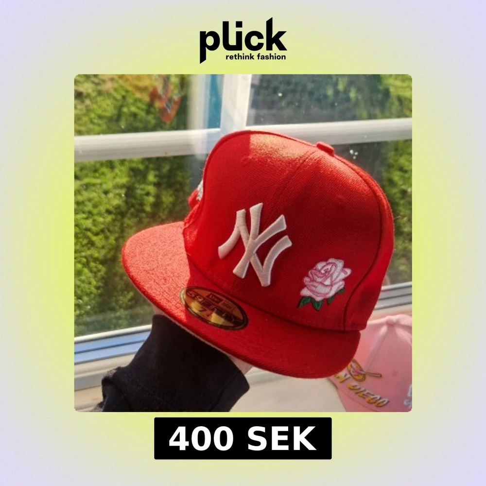 Snygg röd New Era 59FIFTY keps med New York Yankees-logga i vitt framtill och en broderad ros på sidan. Klassisk flat brim och sticker kvar på skärmen. Perfekt statement piece för dig som vill sticka ut.