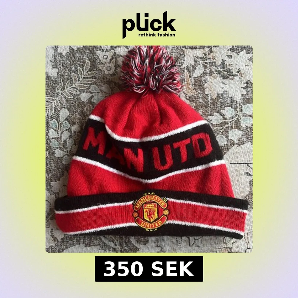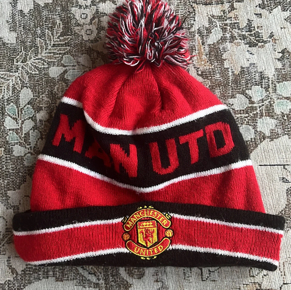 Röd och svart Manchester United mössa med vitrandiga detaljer och stor tofs på toppen. Broderad klubbmärke framtill och texten 'MAN UTD' runt om. Tillverkad i mjukt syntetmaterial, perfekt för kalla dagar på läktaren.