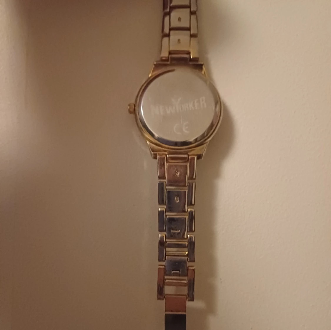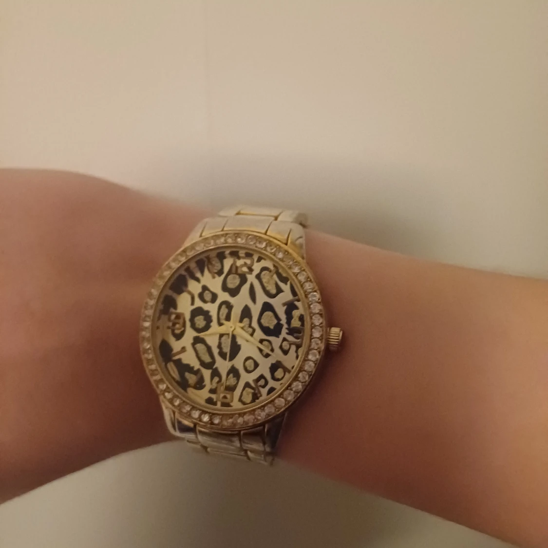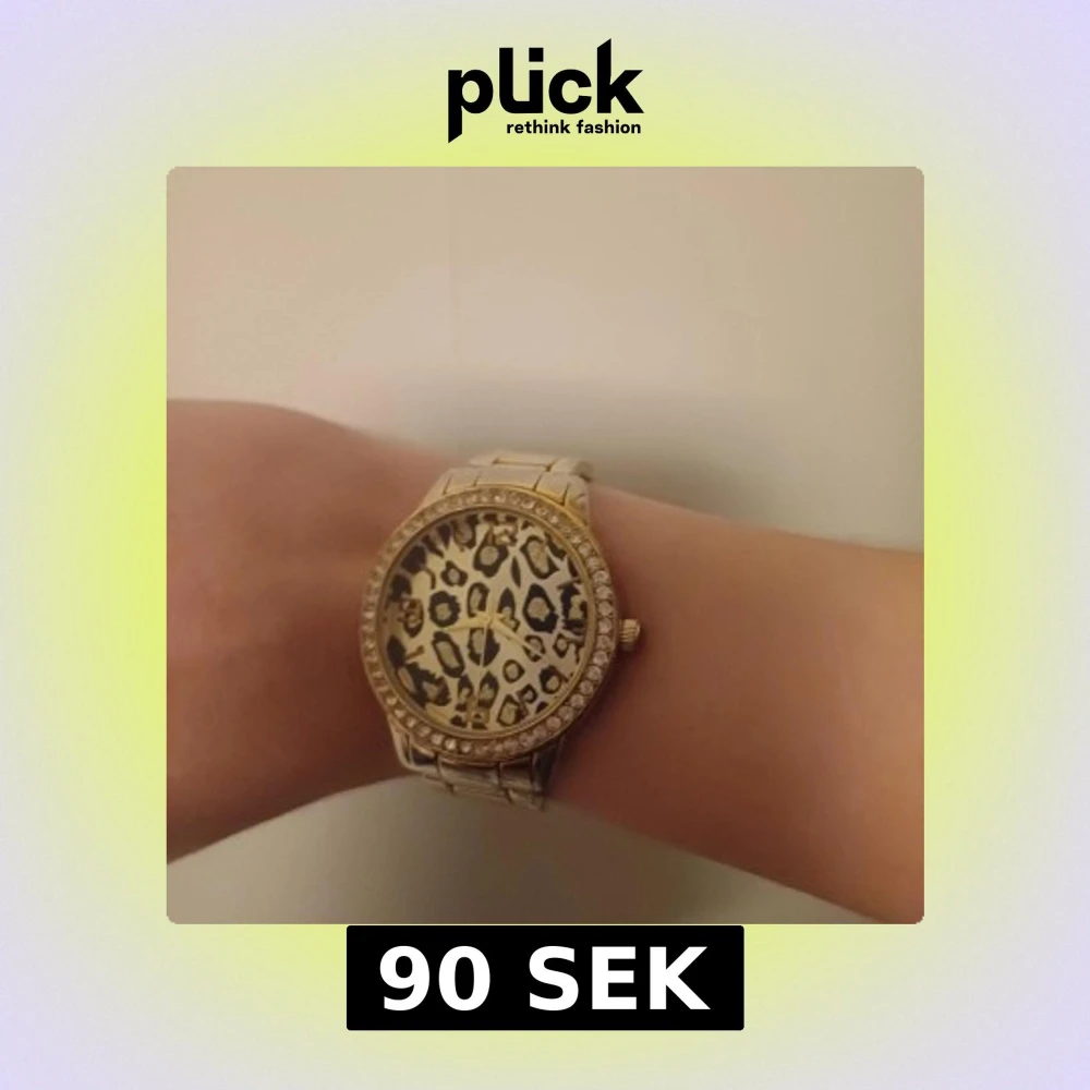 Säljer en snygg klocka från New Yorker med leopardmönstrad urtavla och guldfärgat armband i metall. Runt boetten sitter glittrande stenar som ger extra bling. Klockan har rund form och ett klassiskt metallspänne. Perfekt för dig som gillar djurmönster och guldiga detaljer. ❤️