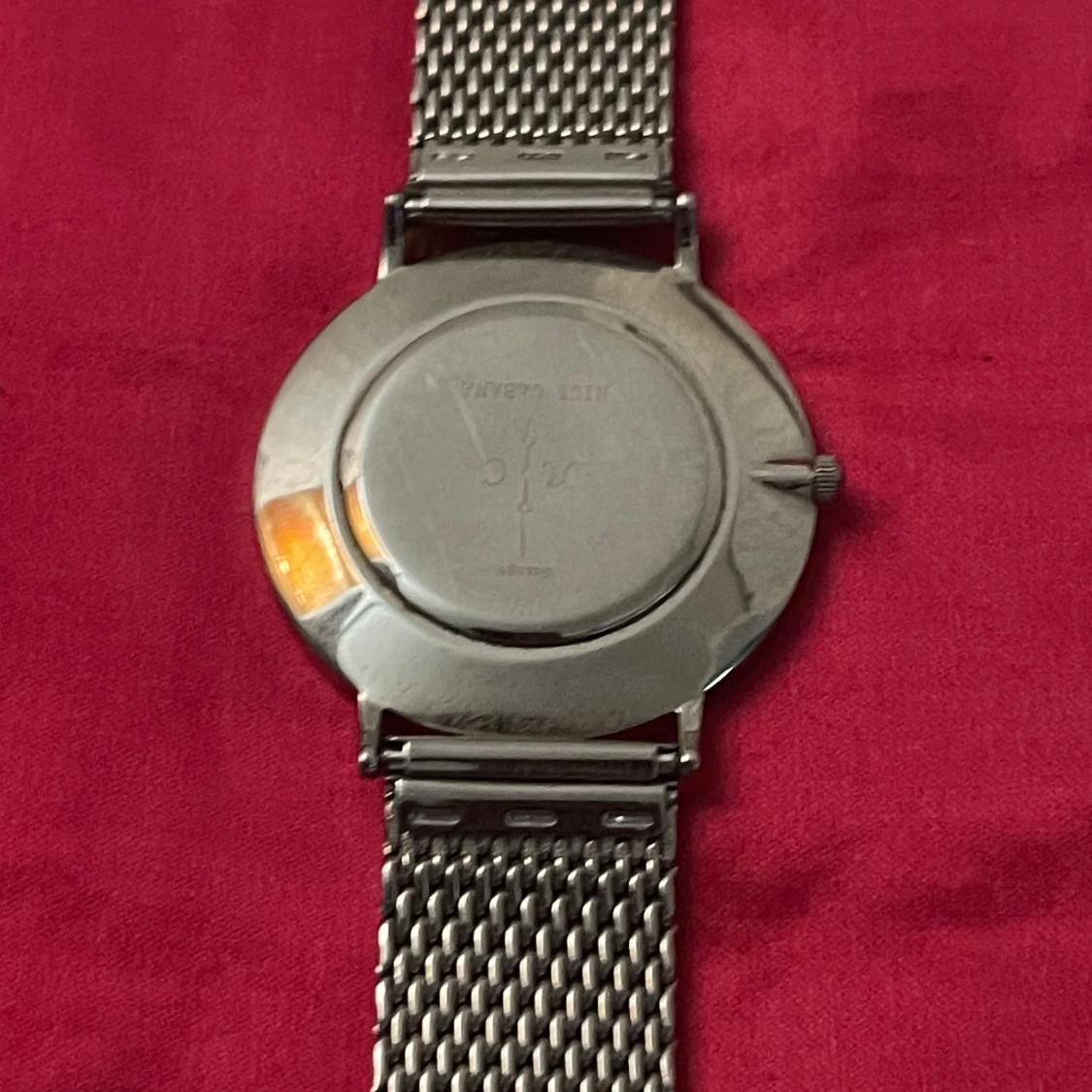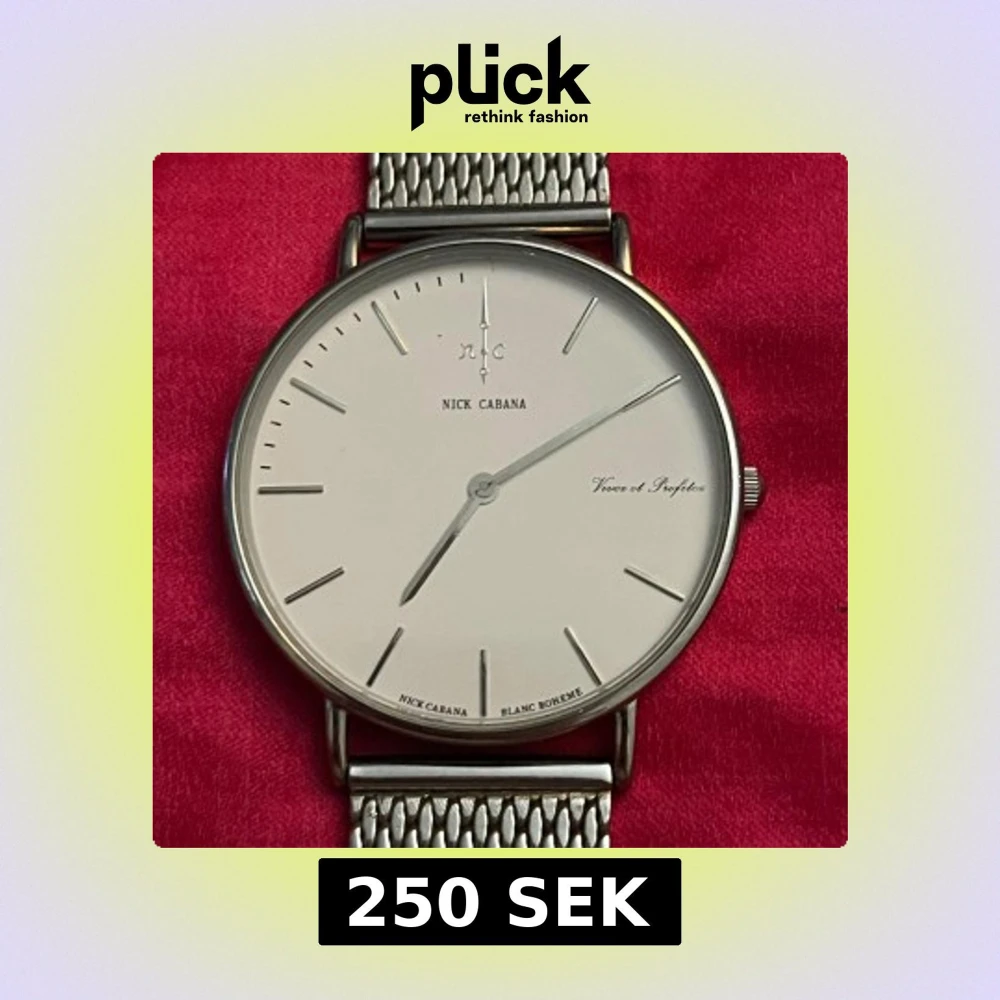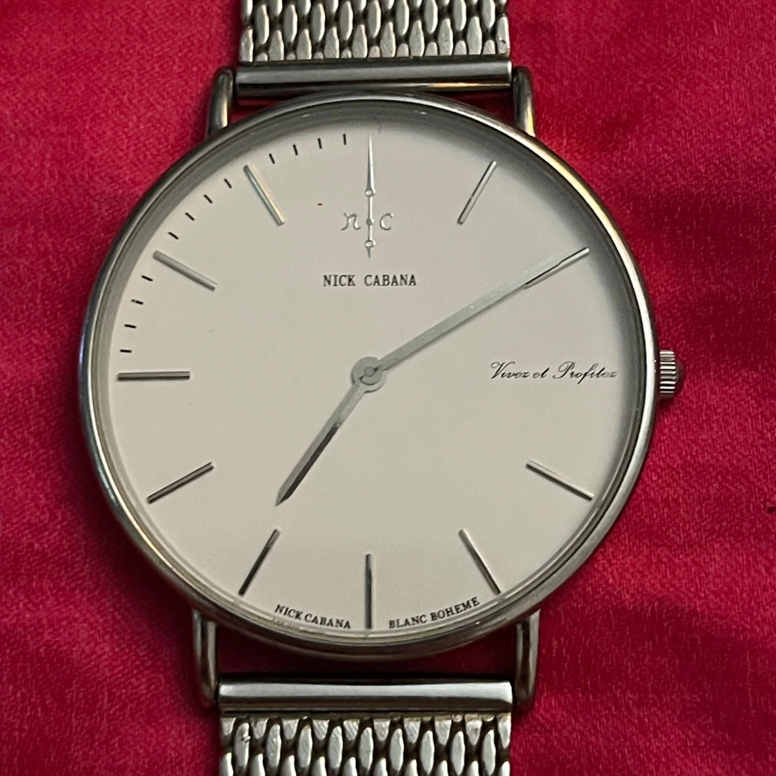 En väldigt stil ren klocka i silver märket är nick cabana passar väldigt bra till många outfits. Batteriet är tyvär slut i klockan.