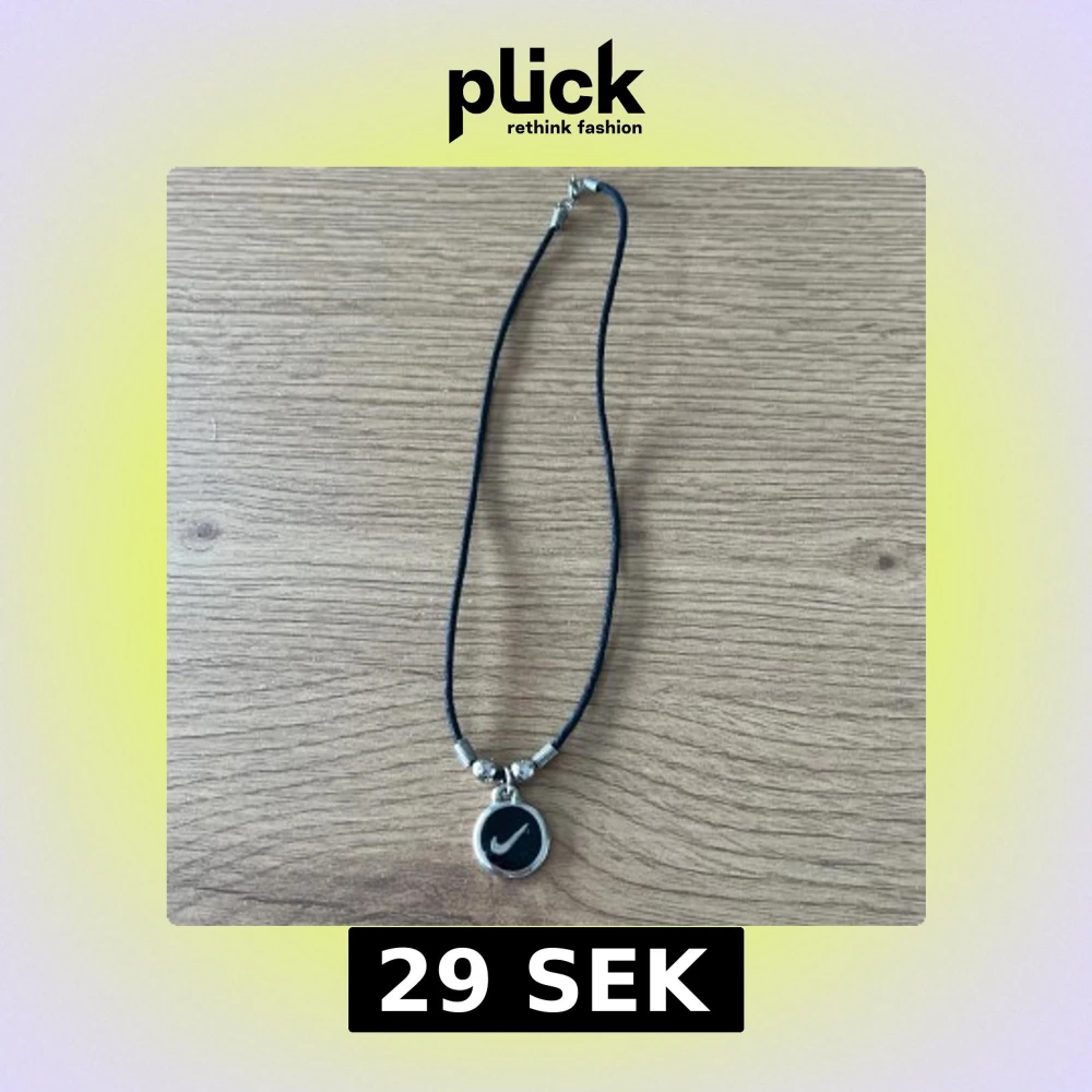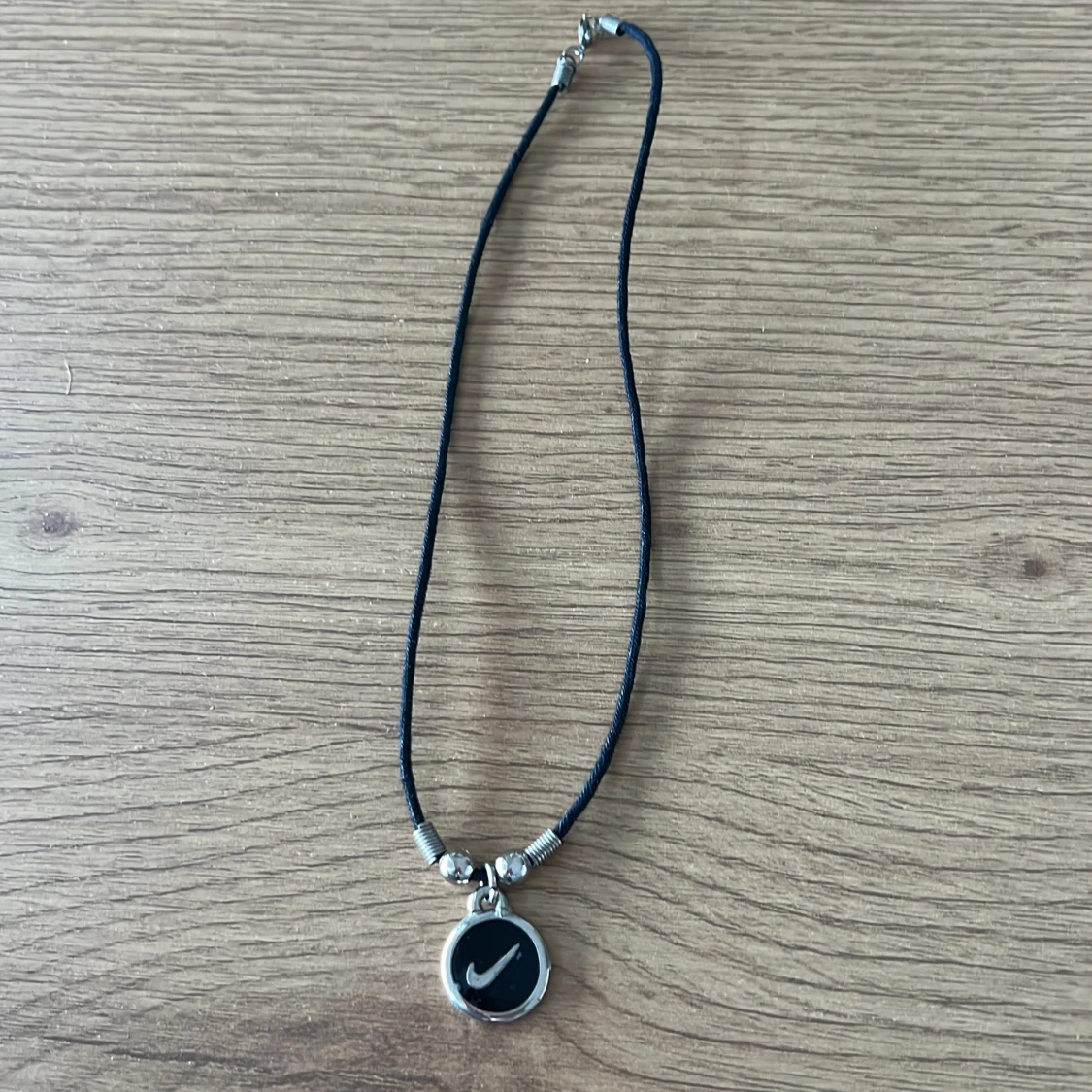 Coolt halsband från Nike med svart snöre och silverfärgade detaljer. Hängsmycket har Nike-loggan på ena sidan och texten 'NIKE' på andra sidan. Perfekt accessoar för dig som gillar sportiga och stilrena smycken.