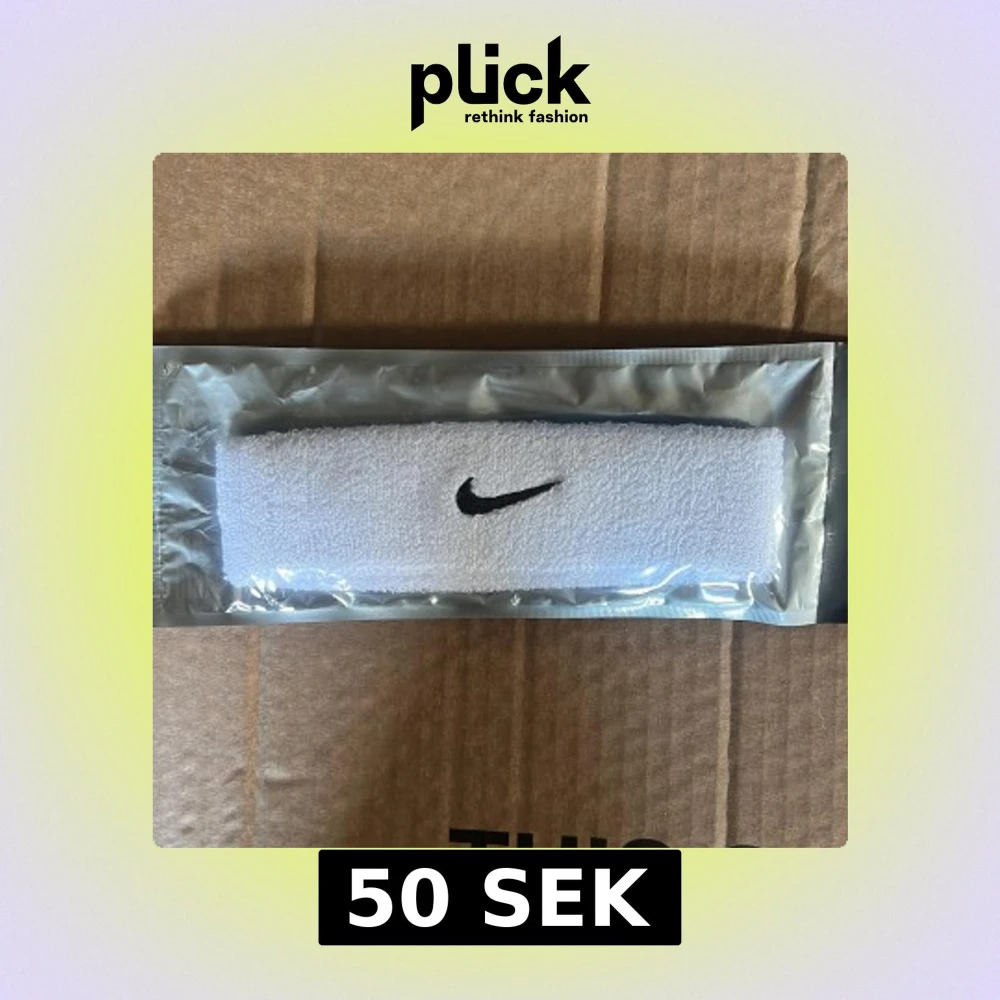 Säljer ett vitt headband från Nike med klassisk svart logga broderad framtill. Perfekt för att hålla håret på plats under träning eller sport. Materialet är mjukt och absorberande. Aldrig andvänt den! Den är fortfarande i förpackningen