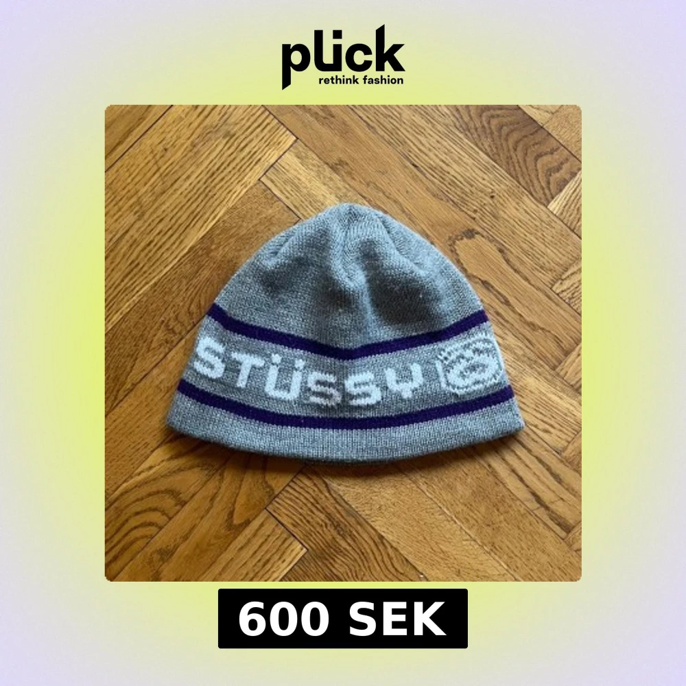 Vintage grå mössa från Stüssy med ett brett vitt och lila band runtom och Stüssy-loggan. Bra skick, 8/10.
