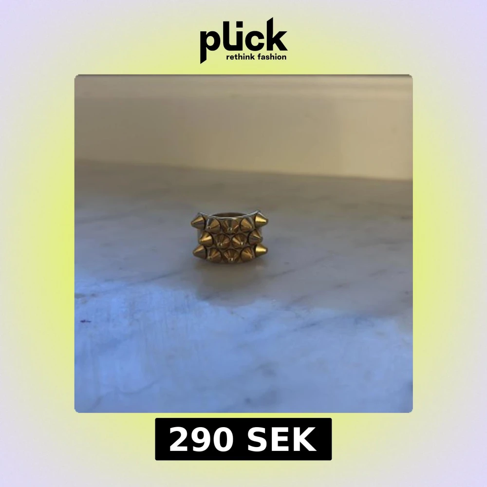 Cool och chunky ring i guldton med fyrkantig form och flera spetsiga nitar på ovansidan. Perfekt accessoar för dig som vill sticka ut och ge din look en edgy vibe. Ringen är bred och täcker en stor del av fingret.