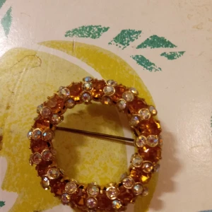 Fin gammal vintage brosch med vita och gula stenar. Fint skick .hämtas i Skene alt skickas .