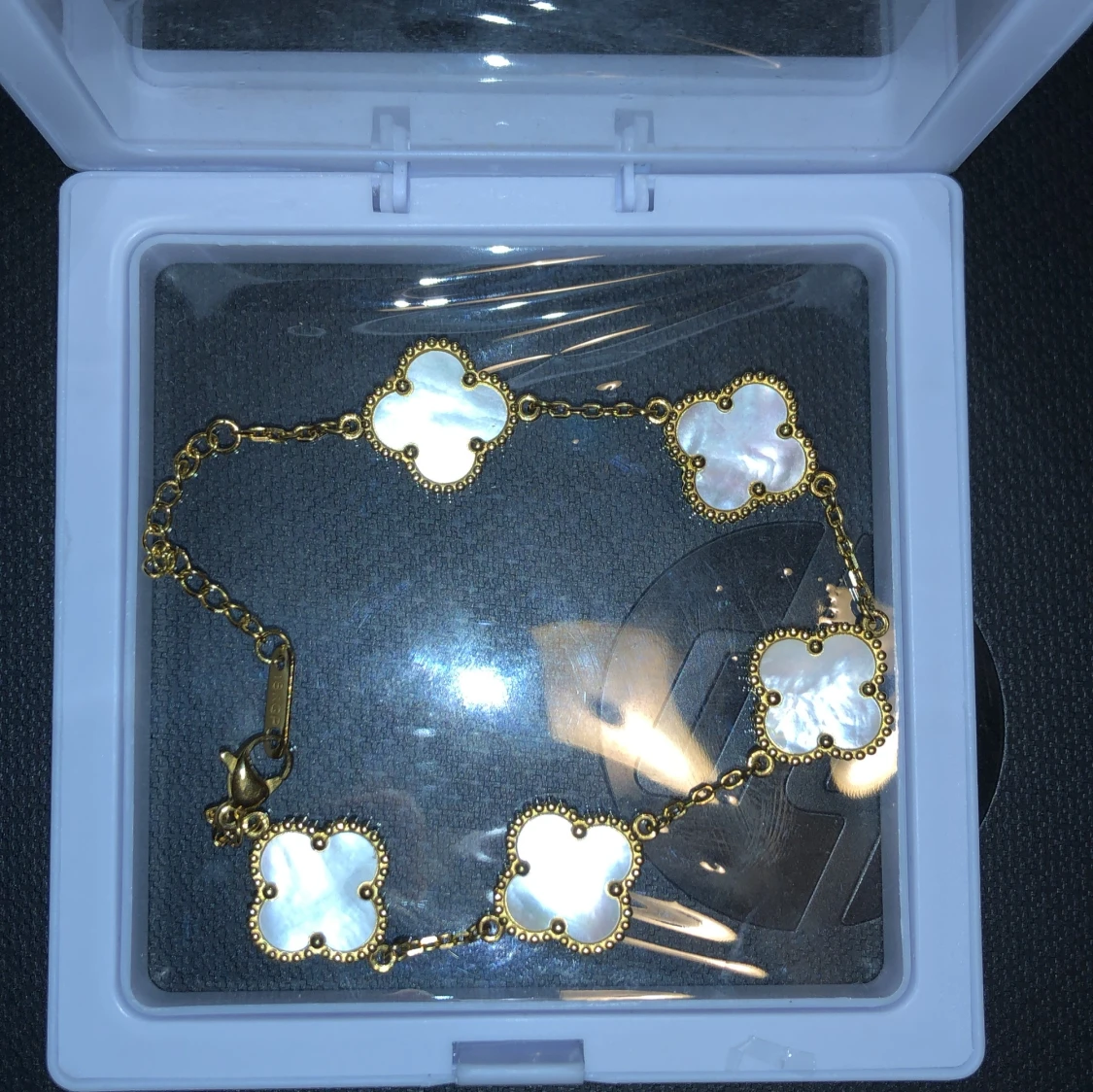 Elegant guldarmband med fem vita fyrklöverformade hängen. Varje hänge har en fin pärlemorfinish som ger en lyxig känsla. Perfekt för att lägga till en touch av elegans till din stil.