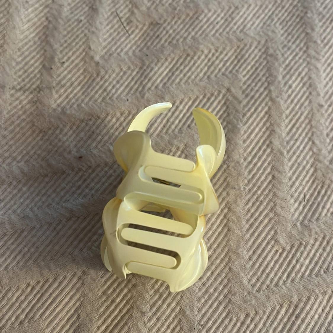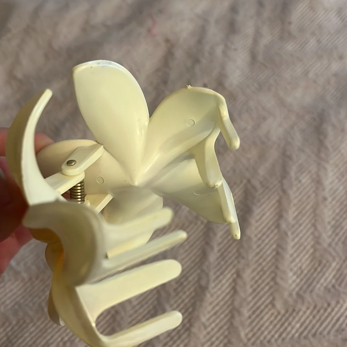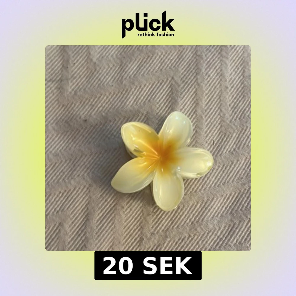 Snygg hårklämma i plast med en stor blomma i ljusgul och vit ton. Blomman har fem kronblad och en mjuk övergång från gul till ljusgul, vilket ger en fräsch och somrig vibe. Perfekt för att ge frisyren en extra touch och sticka ut med en unik accessoar.