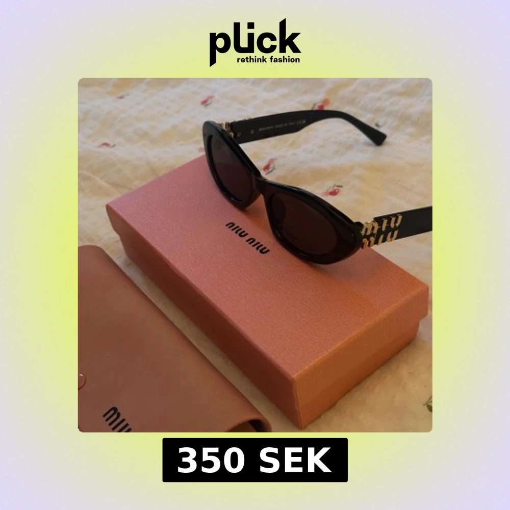 Snygga svarta cat eye solglasögon från Miu Miu med guldiga detaljer och logga på skalmarna. Glasögonen har en cool, retroinspirerad form. OBS! Utan originalfodral och ask. Helt nya och oanvända. Inget kvitto, ni vet varför det är billigt 🌸