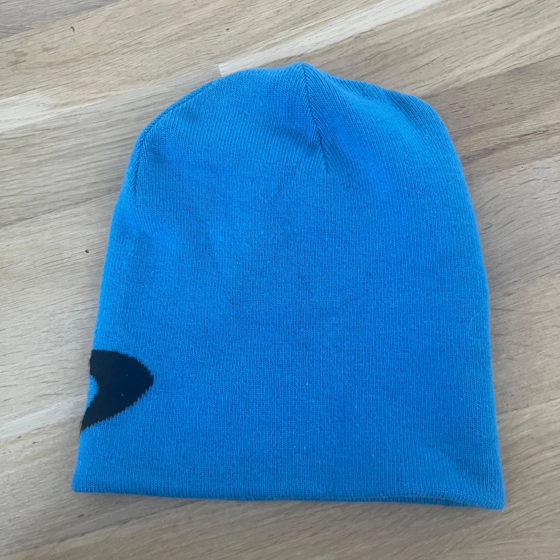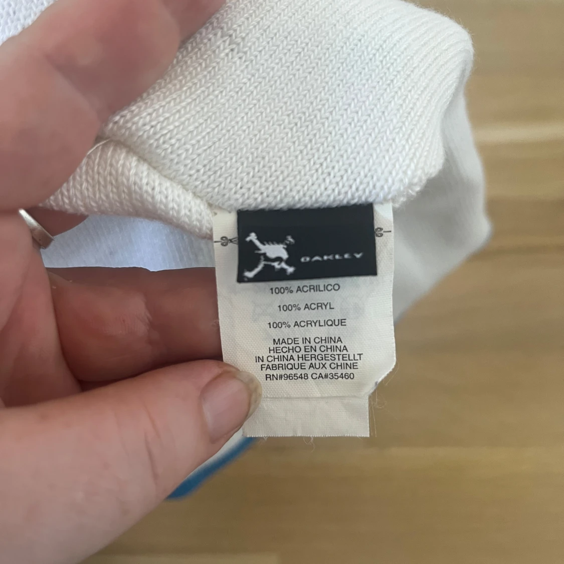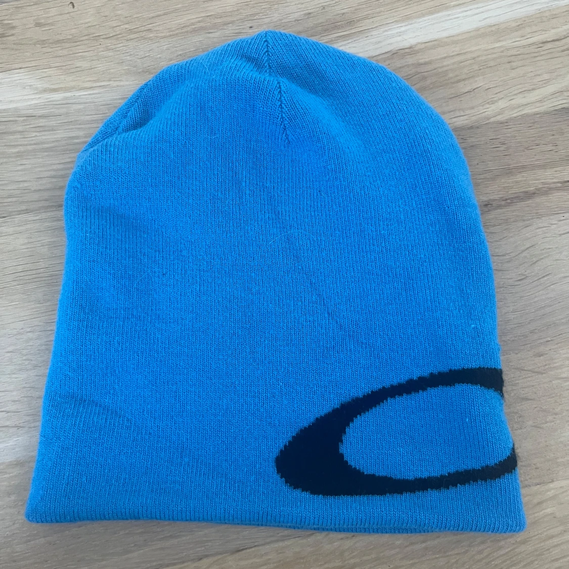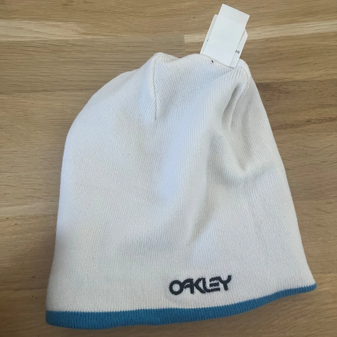 Snygg mössa från Oakley i 100% akryl. Ena sidan är klarblå med svart Oakley-logga, andra sidan är vit med blå kant och broderad Oakley-text.