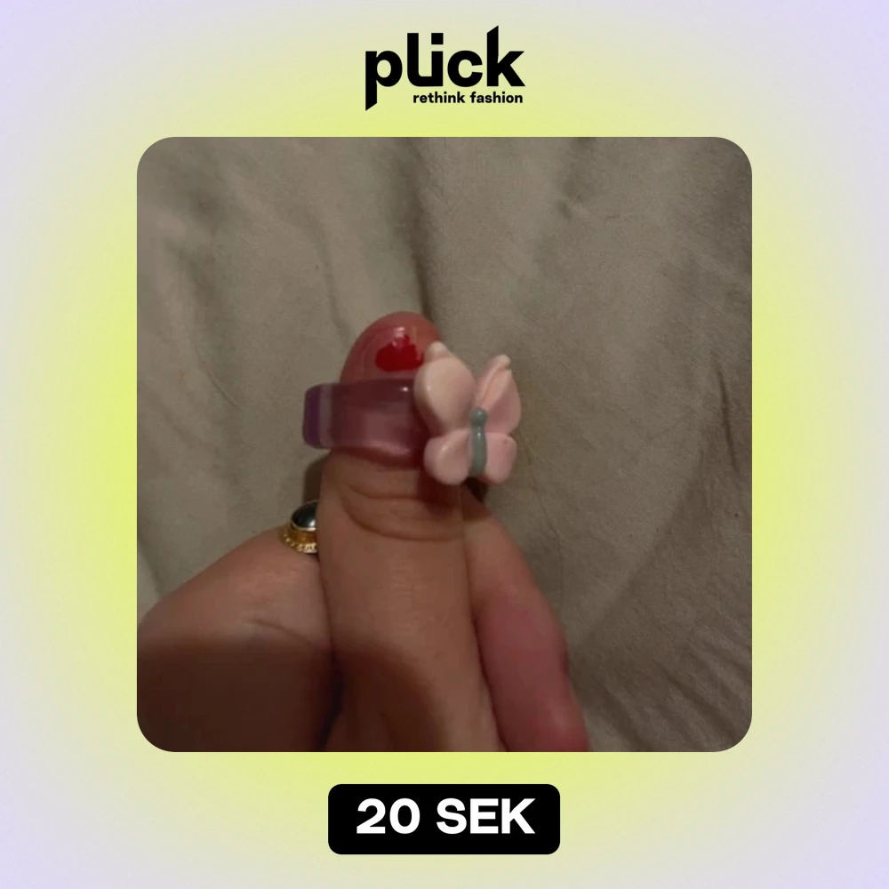 Superfin lila ring med en söt rosa fjäril på toppen. Ringen är i en genomskinlig lila nyans och fjärilen har en liten grön detalj i mitten. Perfekt för att lägga till en lekfull touch till din outfit! 🦋